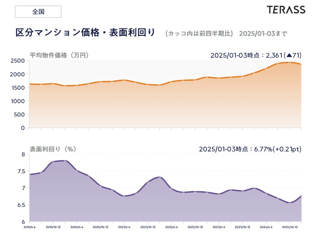 区分マンション価格は2024年10-12月期まで上昇トレンド。直近2025年1-3月期は下落したものの、依然として高水準で推移。