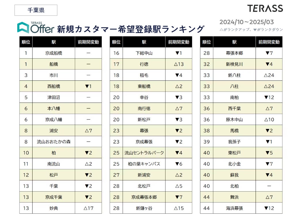 埼玉県と同様、都心の不動産価格高騰の影響か、都心アクセスのよい浦安市や市川市の各駅がジャンプアップ。