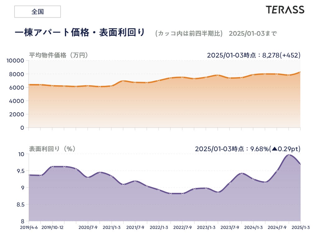 一棟アパートの価格は、2025年1-3月期に微幅で上昇しているが、概ね横ばい。