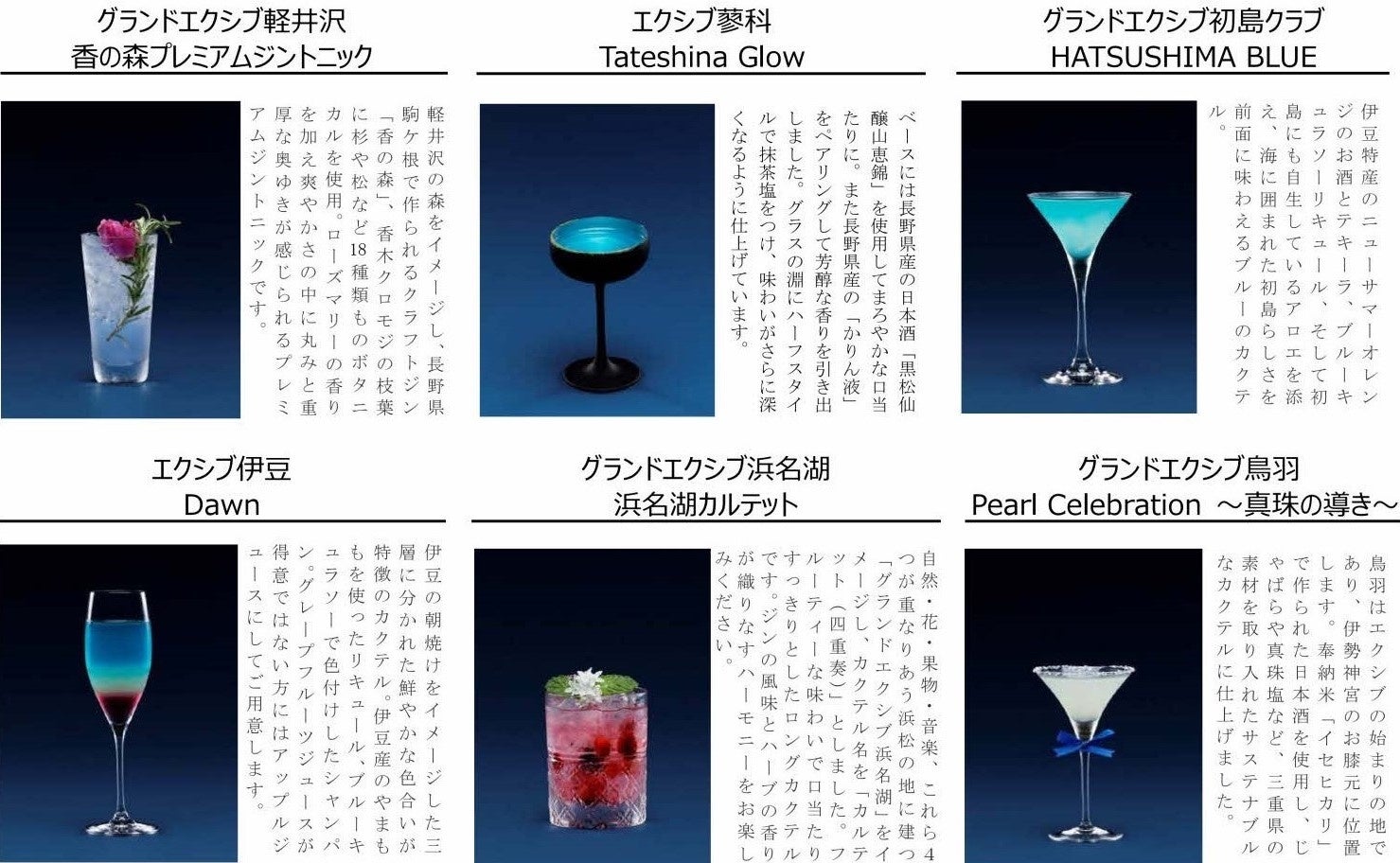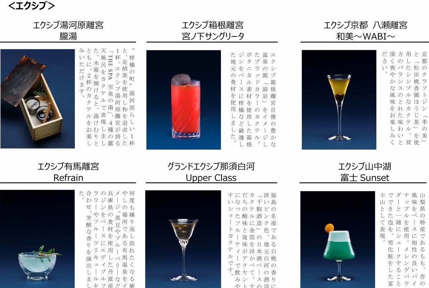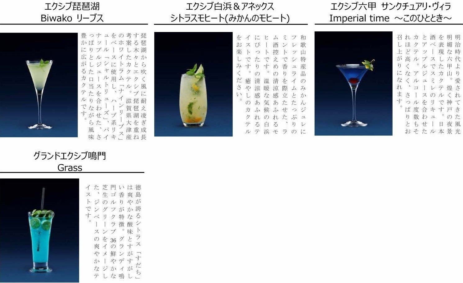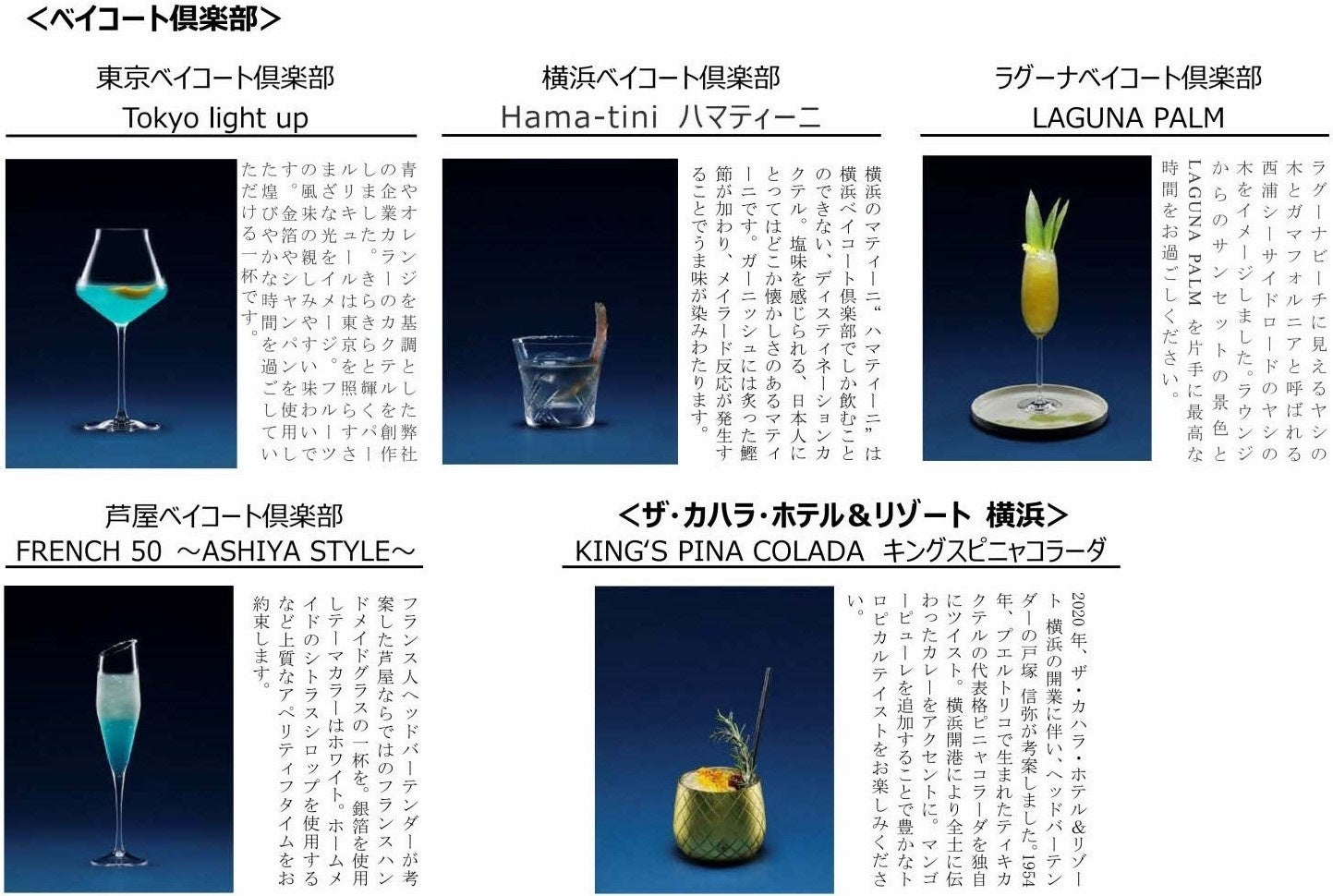 リゾートトラスト「ベイコート倶楽部」、「エクシブ」、「ザ・カハラ・ホテル&リゾート 横浜」カクテルを通じて地域の魅力を伝える「ディスティネーションカクテル」を提供開始