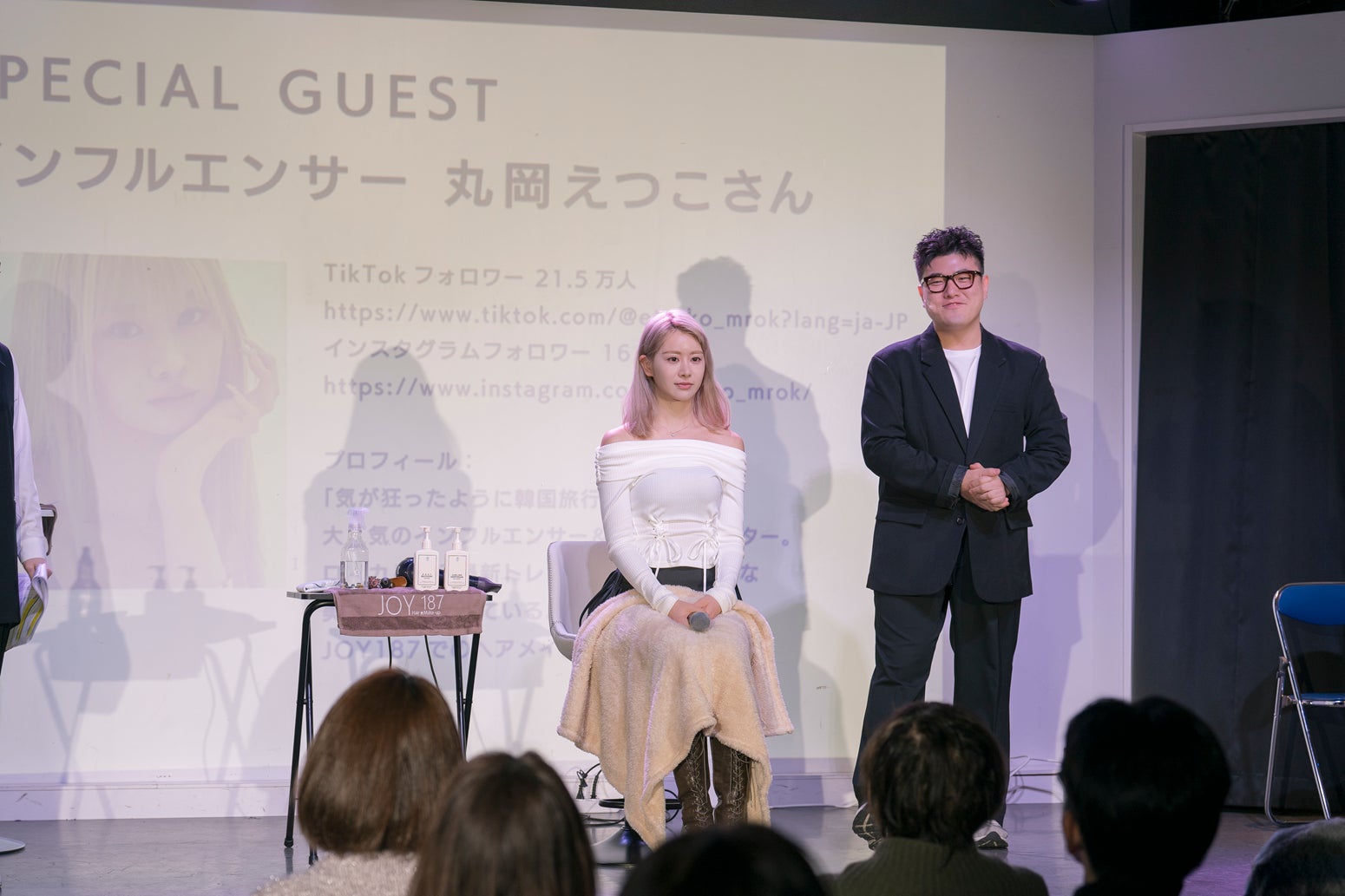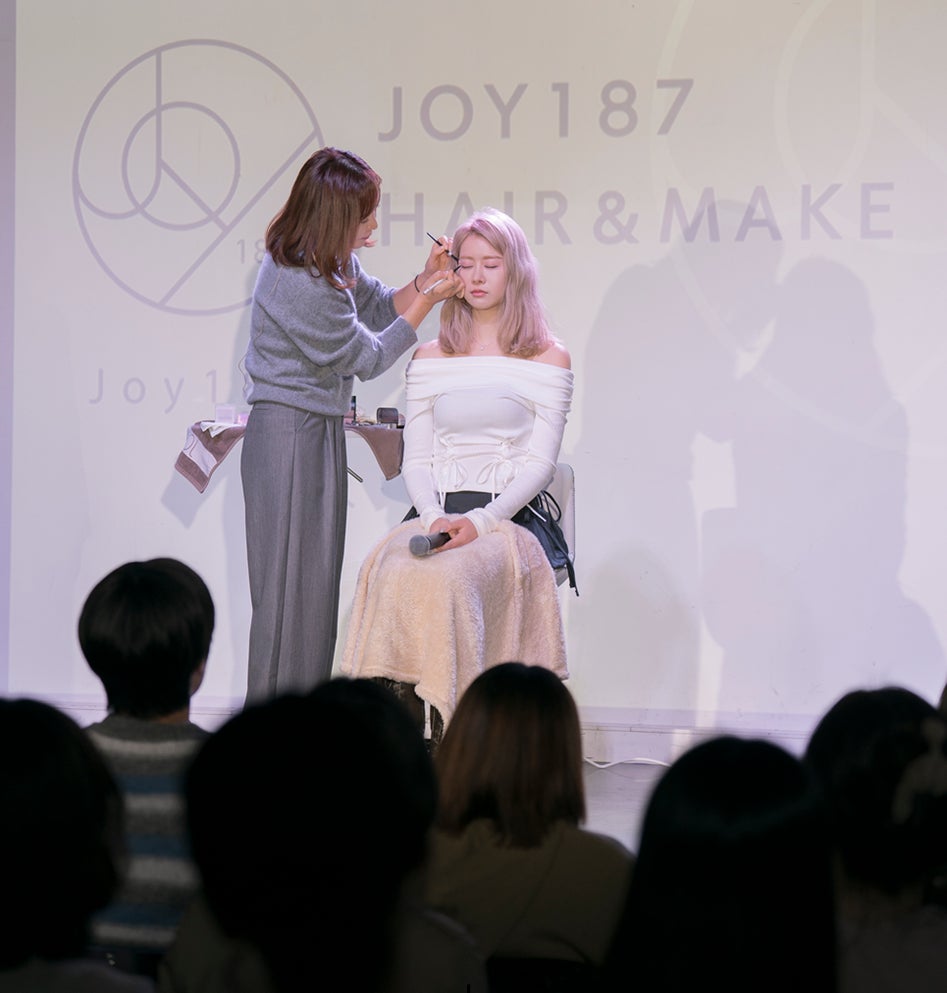 JOY187の4人のTOPクリエイティブディレクターによる「メイクアップお悩み相談会」と「ヘアスタイリング体験会」、日本初上陸の「187LABEL」の新商品展示、インフルエンサー「丸岡えつこ」によるアケアブランドの「販売会」などを行いました。