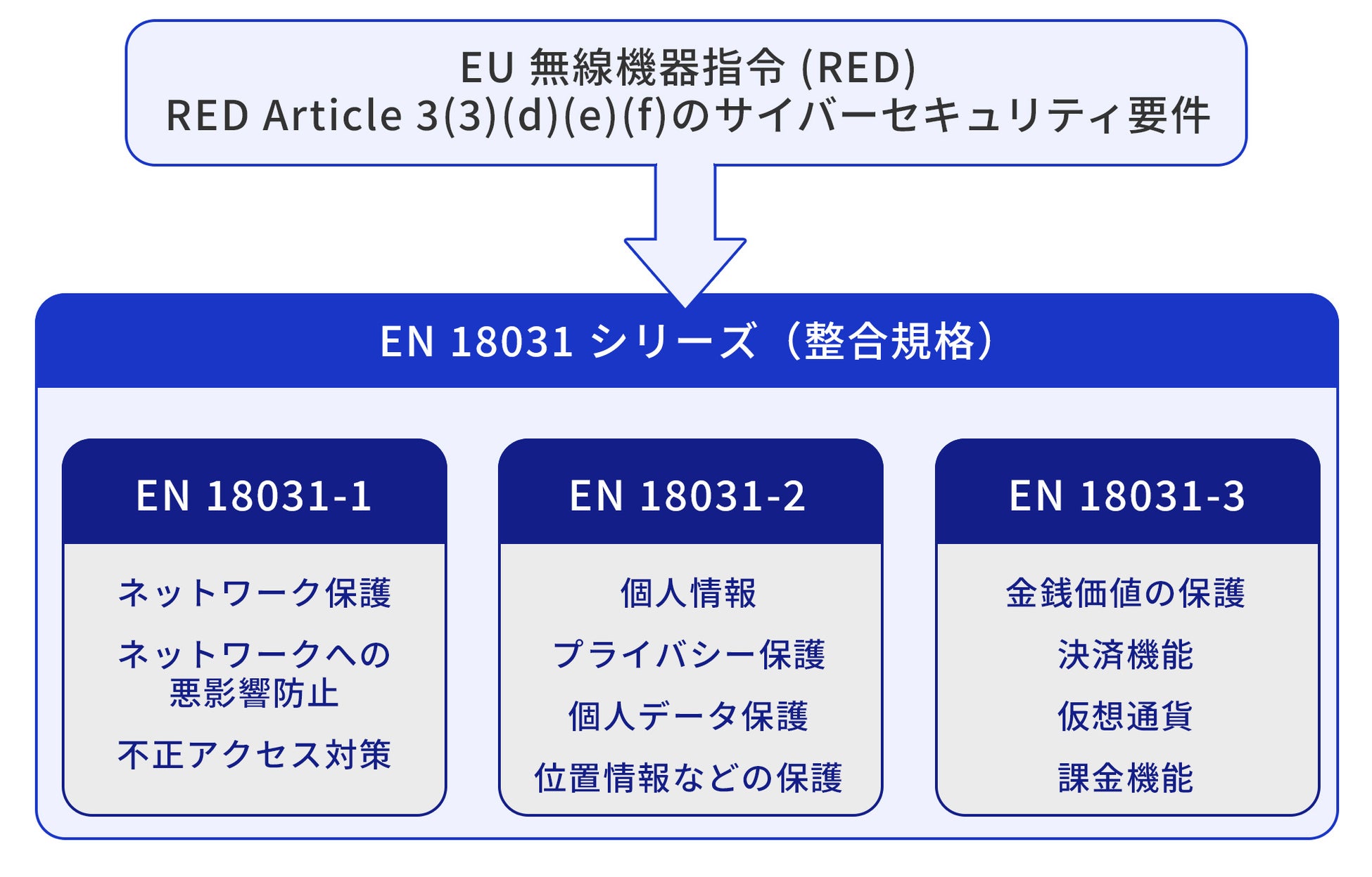 これに対応する整合規格として、欧州委員会はEN 18031シリーズを採用しています(Commission Implementing Decision (EU) 2025/138)。同シリーズは、REDのサイバーセキュリティ要件に対応する整合規格であり、インターネット接続型無線機器のセキュリティ要件を規定しています。