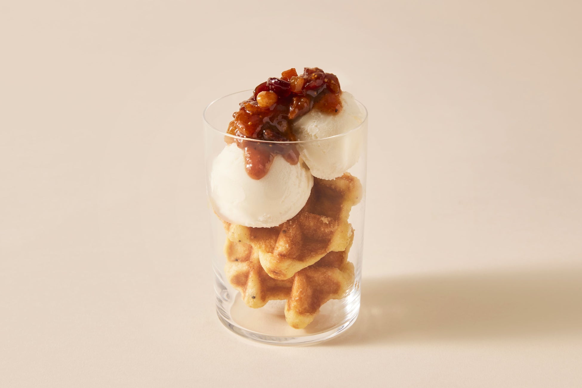 焼きたてのミニリエージュ ワッフルに、北海道・美瑛町のミルクを使用したアイスクリームとレーズンやアプリコット、いちじくなどのドライフルーツにフレッシュジンジャーとスパイスを加え、フルーツピューレで炊き込んだホリデー限定のジャムをトッピング。温かいワッフルに溶け合うアイスクリームとジャムが、より一層ホリデー気分を高めてくれる一品です。
