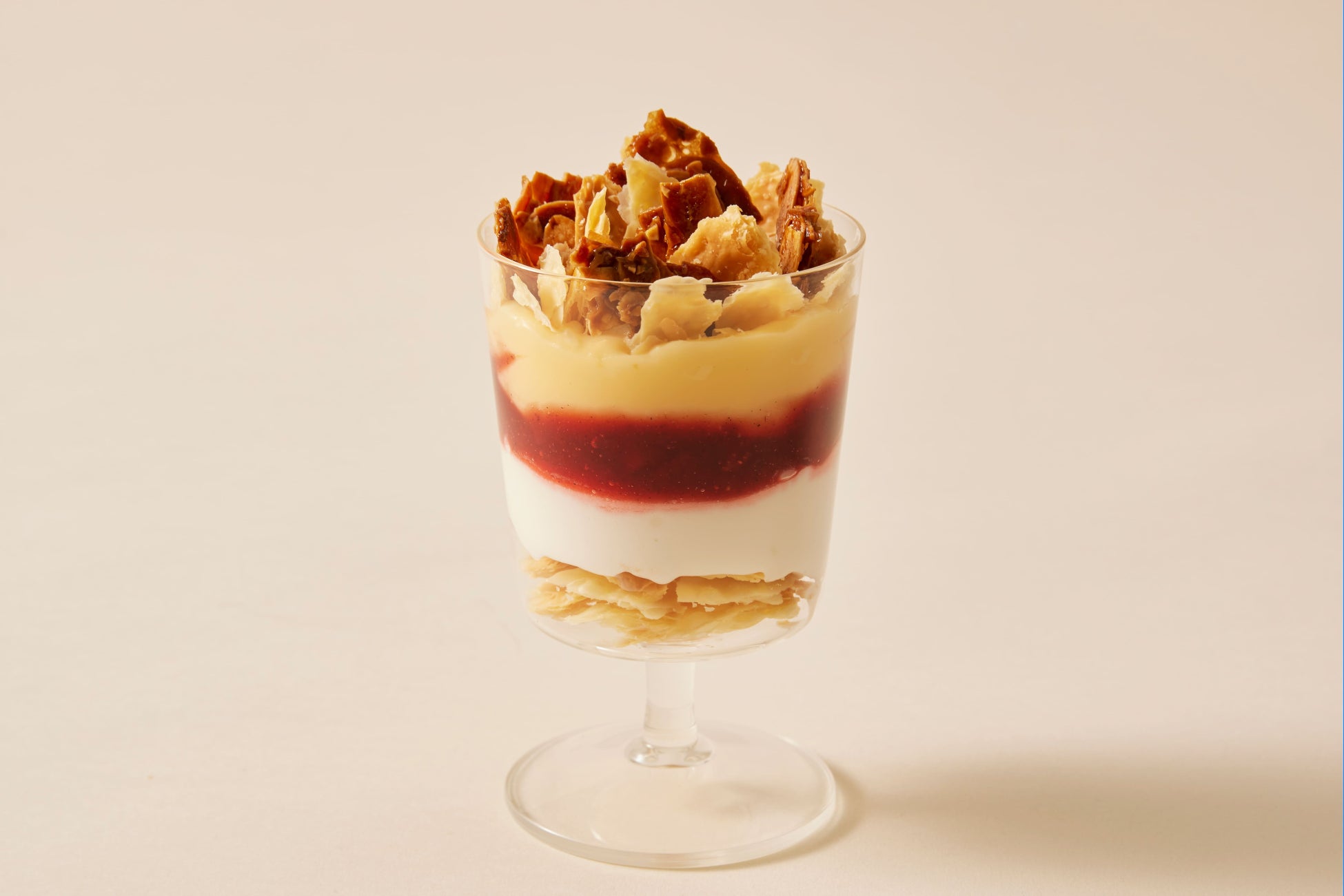 ナポレオンパイをイメージしたホリデーシーズン限定のシーズナルパフェ。いちごのソースとカスタードクリーム、さくさくのパイを重ねてすっきりとした甘味に仕上げ、コーヒーとのペアリングも楽しんでいただけるパフェです。トップに乗せたキャラメルとアーモンドで作ったヌガティーヌの香ばしさがアクセントになり、さらに味わいの層が広がります。