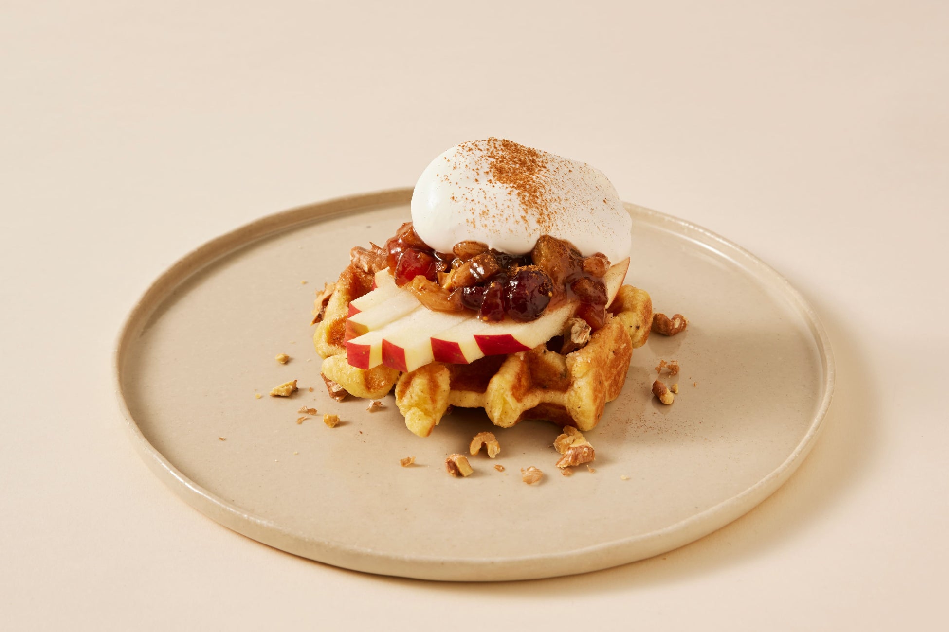 レーズンやアプリコット、いちじくなどのドライフルーツにフレッシュジンジャーとスパイスを加え、フルーツピューレで炊き込んだホリデージャムを焼きたてのリエージュ ワッフルに乗せたワッフルプレート。フレッシュのりんごのみずみずしさ、ホイップクリームのミルキー感、それぞれの味わいを一つのプレートでご堪能いただけます。