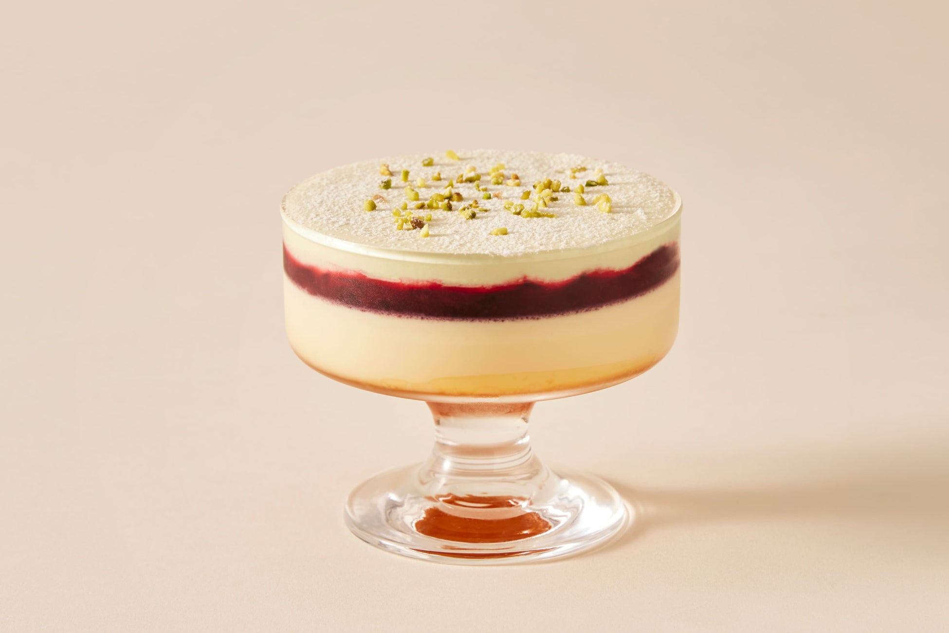 卵や牛乳など素材の味をしっかりと感じるクラシックな味わいのプリンに、甘酸っぱいチェリーコンポートとまろやかなピスタチオのクリームをたっぷりと乗せました。香ばしいピスタチオをトッピングしカリッとした食感を加え、豊かな風味を引き立てます。チェリーコンポートには数種類のチェリーやベリーを使用し、奥行きのある味わいに。
