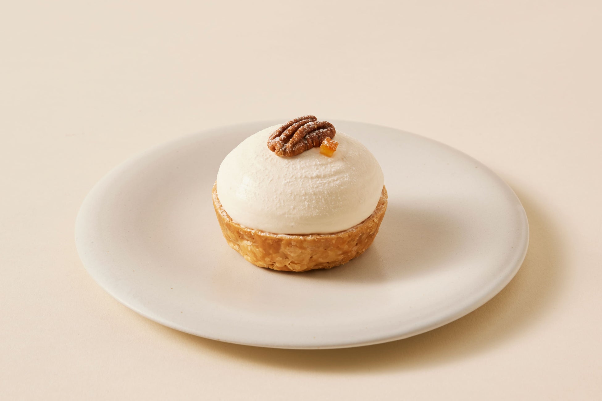 香ばしく焼き上げたタルト生地に、カスタードクリームと生クリームを合わせたディプロマットクリームとメープルキャラメルソースを敷き込み、メープルキャラメルの風味と絶妙に調和するピーカンナッツとオレンジコンフィを忍ばせました。ふんわりと乗せたメープルキャラメルホイップがリッチな甘さで全体を包み込み、一口ごとに味わいの変化が楽しめます。