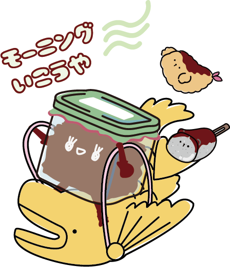 相棒の「愛しゃちほこ」に乗った「手前みそちゃん」とみそをつけられ泣く泣くペットになった「えびふらいぬ」「でんがくねこ」のお散歩シーンがプリントされています。
