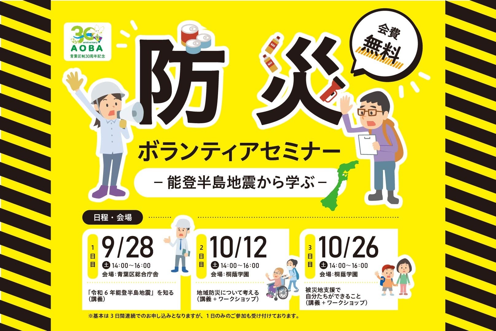 学校法人桐蔭学園(横浜市、理事長:溝上慎一)は、「防災ボランティアセミナー -能登半島地震から学ぶ-」を9月28日(土)、10月12日(土)、10月26日(土)14:00~16:00の3日間連続セミナーとして開催します。横浜市青葉区役所や地元商店会協同組合から講師を招き、防災ボランティアとしての知識に加え、避難所や復興支援につながる行動を起こすためのスキルを身につけることを目指します。