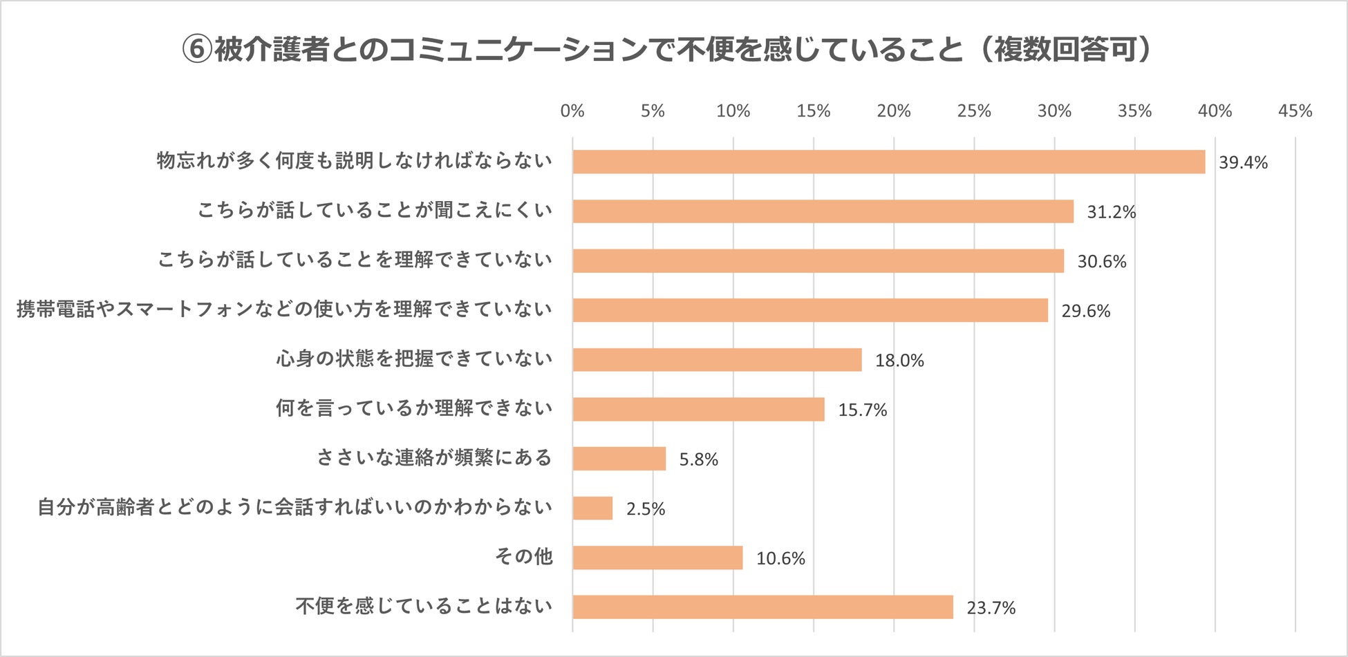 また、担っている方が最も多い「コミュニケーション」について、「被介護者とのコミュニケーションで不便を感じていること」を調査したところ、最も多かった回答は「物忘れが多く何度も説明しなければならない」の39.4%で、次いで「こちらが話していることが聞こえにくい」が31.2%、「こちらが話していることを理解できていない」が30.6%、「携帯電話やスマートフォンなどの使い方を理解できていない」が29.6%でした(グラフ⑥)。