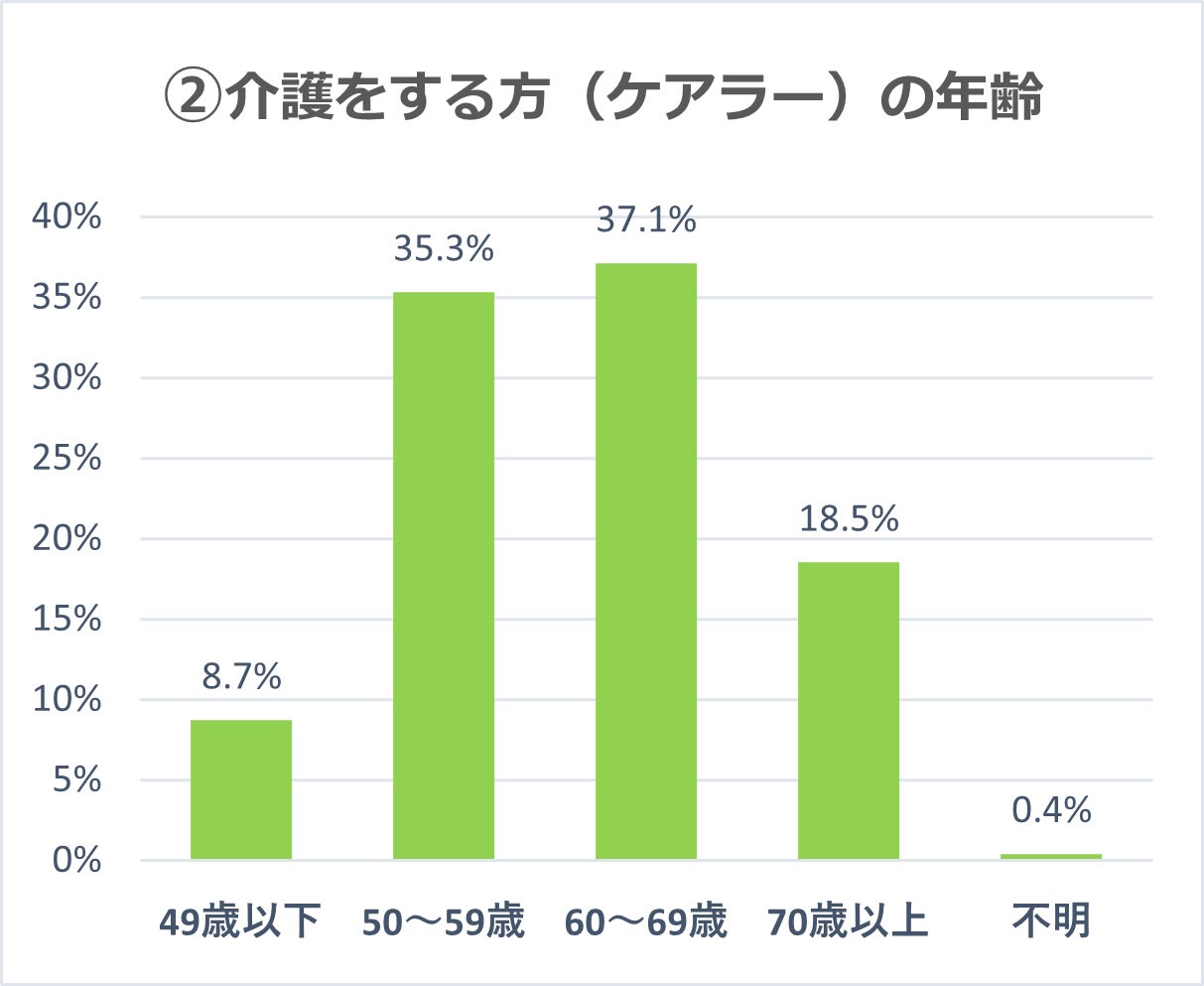 また、ケアラーの年齢は49歳以下が8.7%、50歳代が35.3%、60歳代が37.1%、70歳以上が18.5%で、50歳代と60歳代が全体の7割以上を占めていました(グラフ②)。
