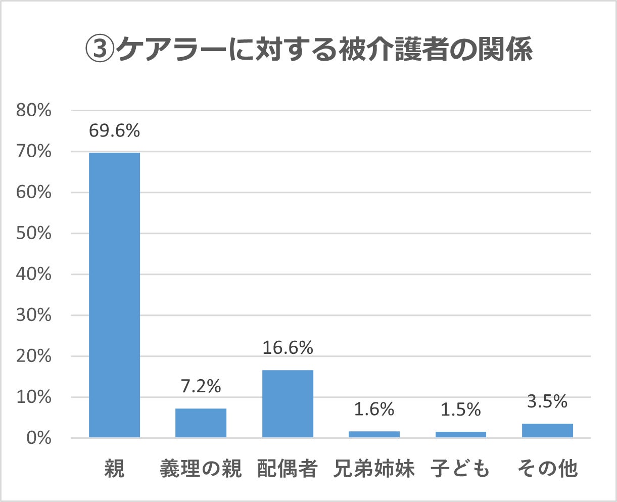 ケアラーに対する被介護者の関係は、親が69.6%、義理の親が7.2%、配偶者が16.6%、兄弟姉妹が1.6%、子どもが1.5%、その他が3.5%でした。親と義理の親を合わせると、親の介護をしている方が76.8%と8割近く、次いで配偶者の介護をしている方が多いことがわかりました(グラフ③)。