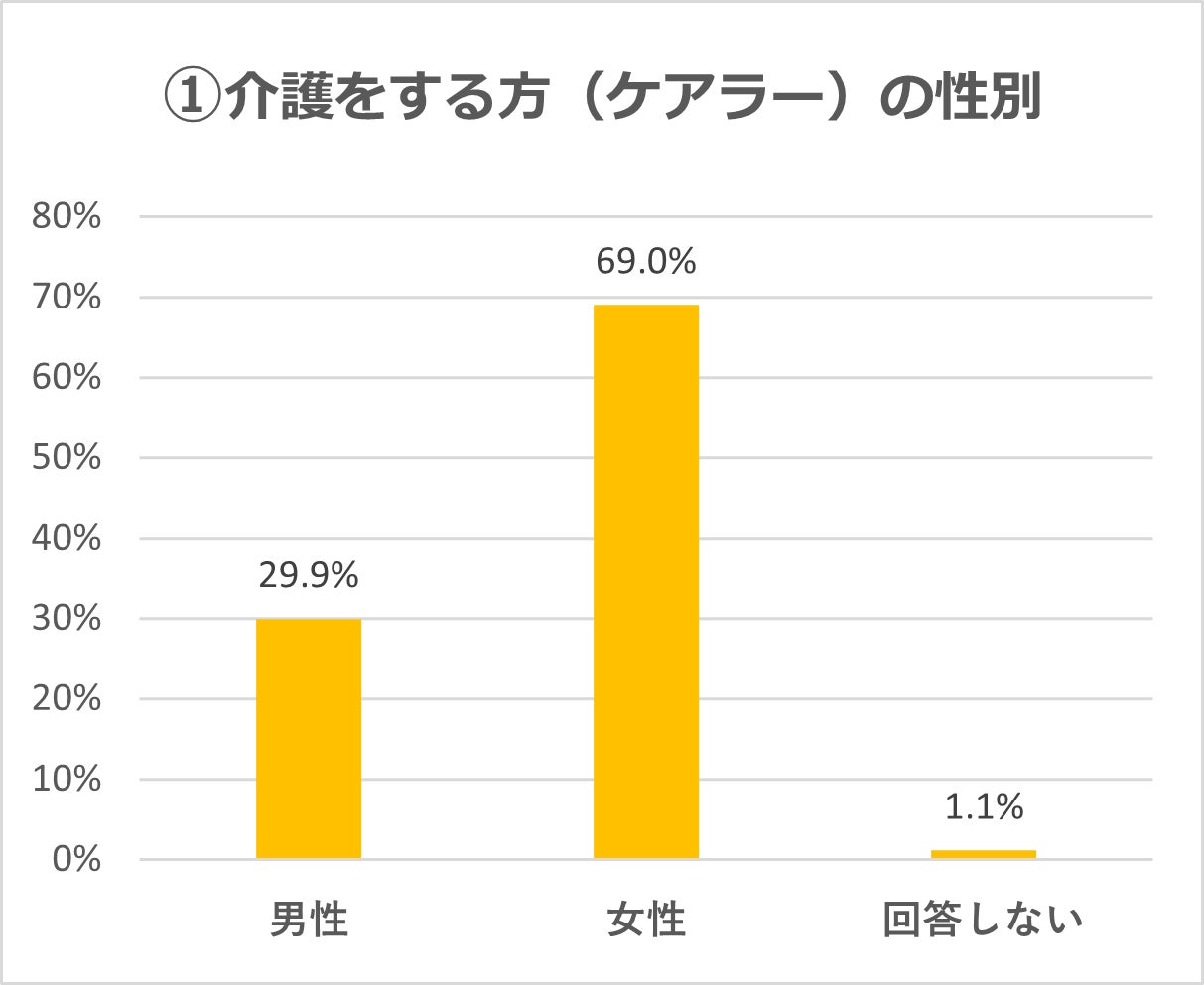 当社の介護サービスをご利用いただいている方のご家族を対象とした調査の結果、家族などの介護をしているケアラーの性別は、「回答しない」と答えた1.1%の方を除き、男性が29.9%、女性が69.0%で、男性が約3割、女性が約7割という結果でした(グラフ①)。