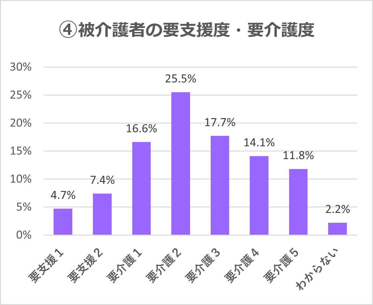 また、被介護者の日常生活にどの程度の支援や介護が必要かを示す指標である「要支援度・要介護度」については、要支援1の方が4.7%、要支援2の方が7.4%、要介護1の方が16.6%、要介護2の方が25.5%、要介護3の方が17.7%、要介護4の方が14.1%、要介護5の方が11.8%で、日常生活全般に介護が必要な状態とされている要介護3以上の方は43.6%と4割以上にのぼりました(グラフ④)。