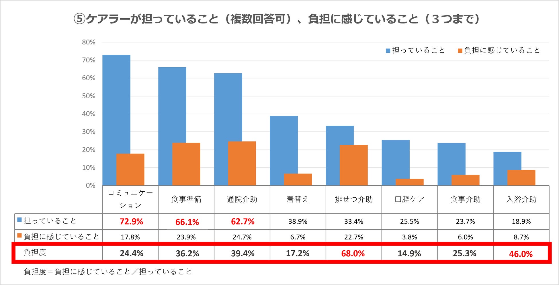 担っていることのそれぞれについて、負担に感じている方の割合を示す「負担度」を算出したところ、「排せつ介助」は担っている方の68.0%が負担に感じており、担っていることの中で最も負担度が高くなっています。デイサービスなどを利用している方も多いためか、「入浴介助」を担っている方は全体の2割以下と少ないものの、負担度は46.0%と高くなっていました(グラフ⑤)。
