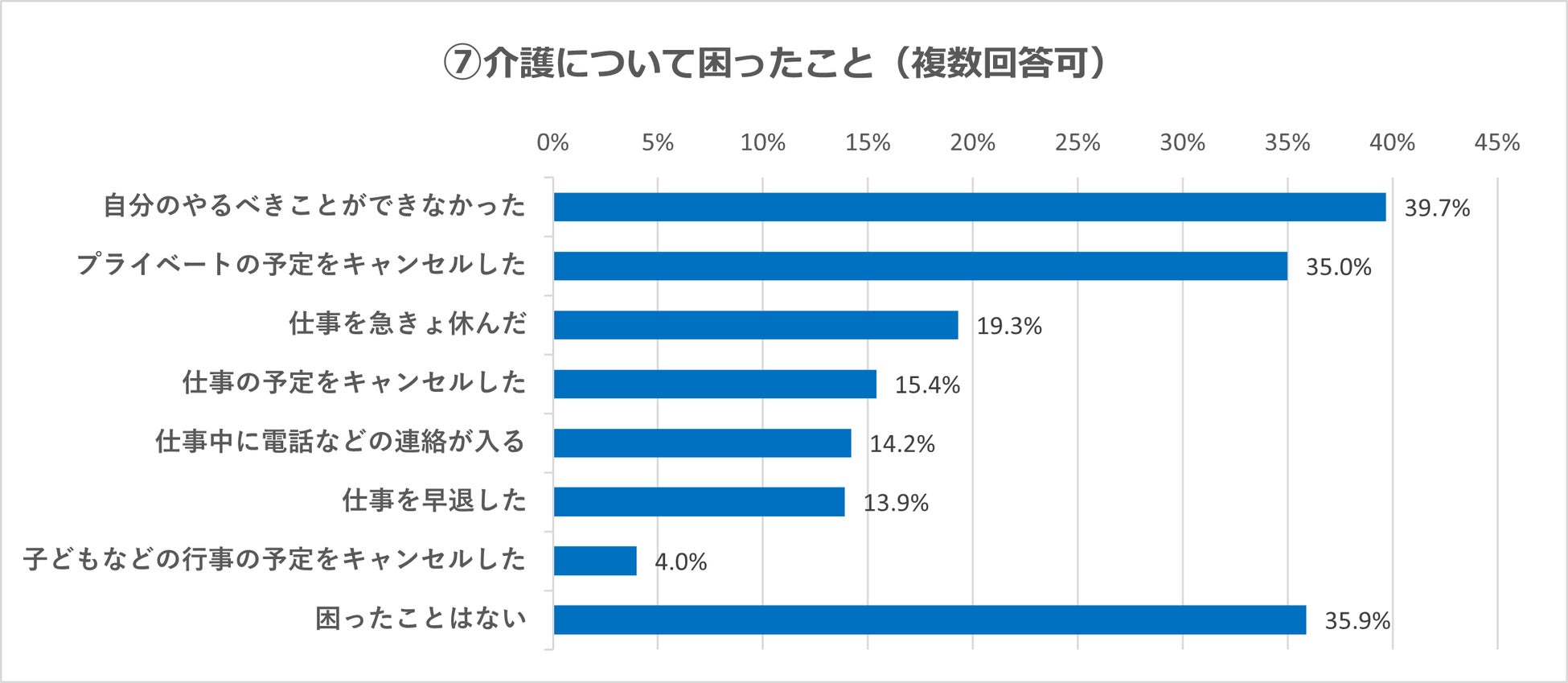 また、「介護について困ったこと」を調査したところ、最も多かった回答は「自分のやるべきことができなかった」で39.7%、次いで「プライベートの予定をキャンセルした」が35.0%、「仕事を急きょ休んだ」が19.3%、「仕事の予定をキャンセルした」が15.4%でした(グラフ⑦)。「困ったことはない」という回答も35.9%あったものの、介護のために自分のやるべきことができなかった経験のある方は4割近く、また、およそ5人に1人は介護のために仕事を急きょ休んだ経験があることになります。