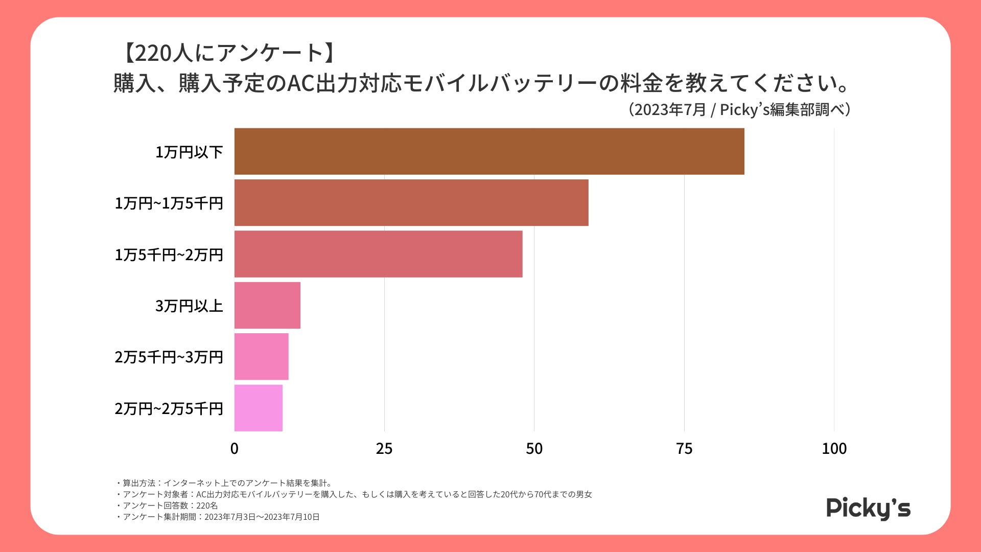 1位が「1万円以下」、2位が「1万円~1万5千円」、3位が「1万5千円~2万円」の価格帯のAC出力対応モバイルバッテリーという結果になりました。比較サイトでの人気ランキングでも「1万円以下」が上位になっていました。