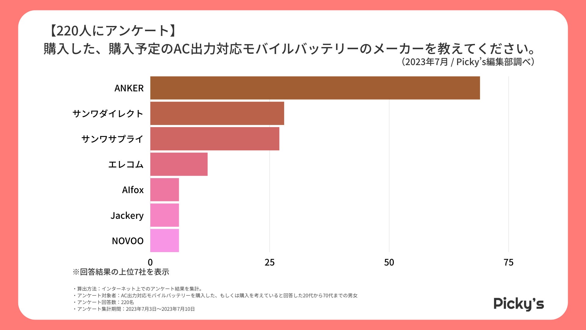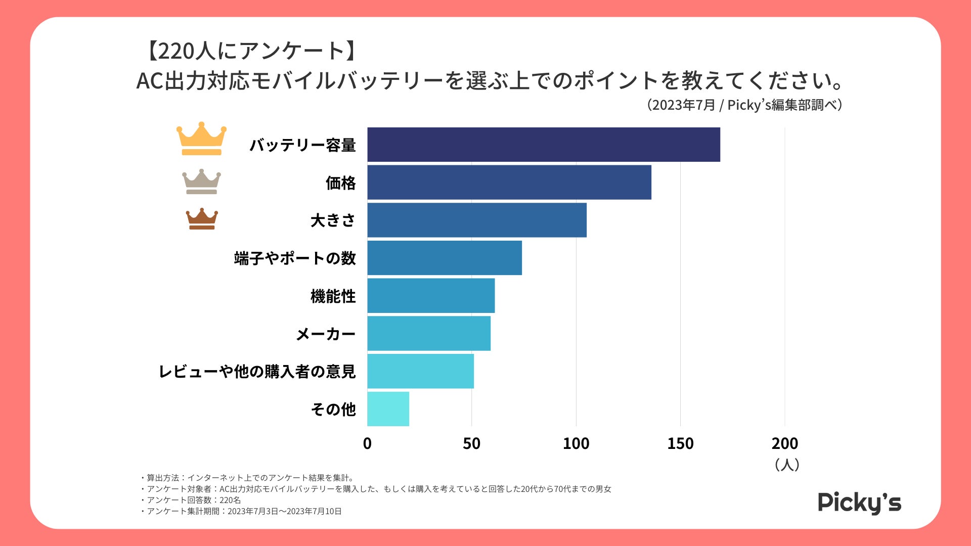 「Picky’s」は、インターネットショッピングにおいて、購入前に試せない・選ぶべきものがわからないという課題の解決を目標に、あらゆる商品のおすすめランキングや検証レビューを紹介するサイトです。このたびPicky’s(https://rentry.jp/note/)では、AC出力対応モバイルバッテリーについてインターネット上でアンケート調査を行いましたので発表いたします。