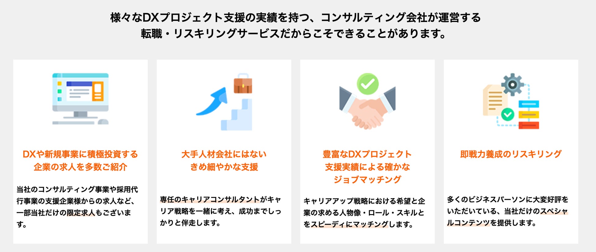 前述の通り、数多くのDX伴走支援の実績とそれによる企業が求める人材像への理解という当社の強みを活かし、募集企業と求職者との高精度なマッチングを実現します。また実践的なリスキリングプログラムの提供によりビジネスパーソンの継続的なスキル獲得とキャリア戦略構築が可能となり、より一層のキャリアアップの機会を提供することが可能です。