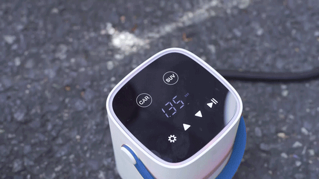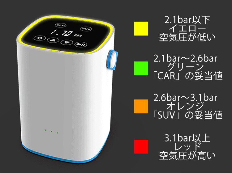 「CAR」を選択すると2.3~2.5bar、「SUV」を選択すると2.6~3.0barの空気圧が注入されます。
