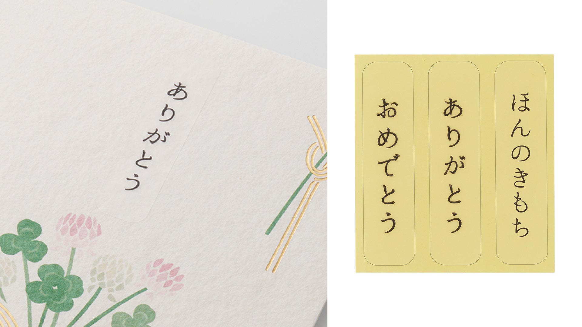 万円袋は従来品の3種「ガーベラ」「チューリップ」「ミモザ」に、流行色のパープルでまとめた「スミレ」、幸せの象徴とされる四葉のクローバーを添えた「クローバー」が新たに加わり全5種となります。表書きが印刷されていない「クローバー」には表書きシール3枚「おめでとう」「ありがとう」「ほんのきもち」が付属し、それぞれの場面に合わせてふさわしい表書きを選んで使用することができます。