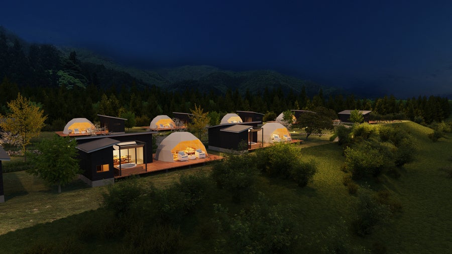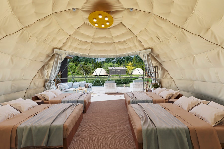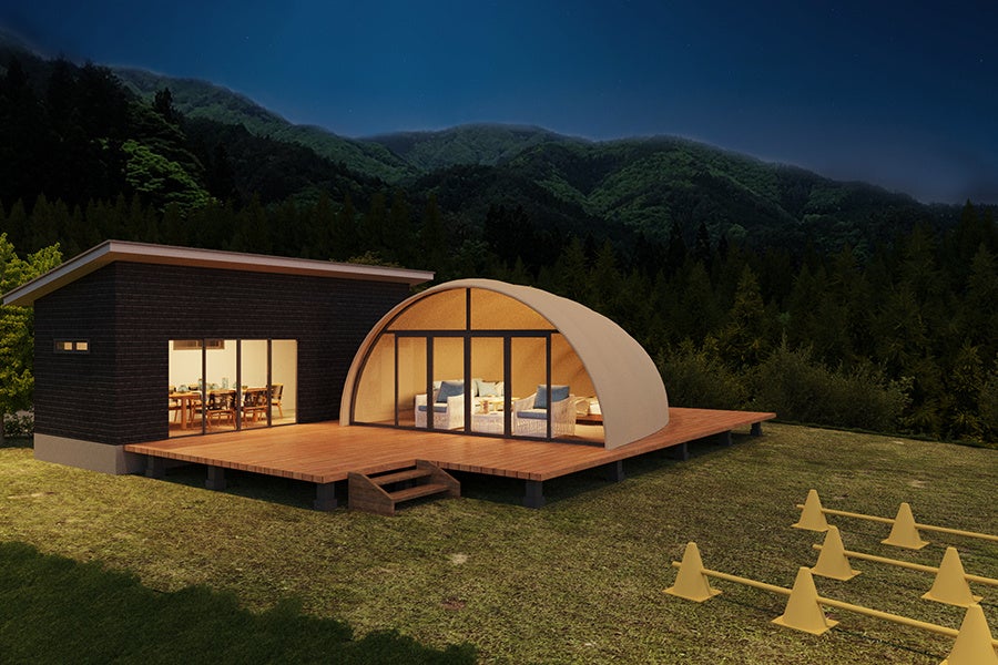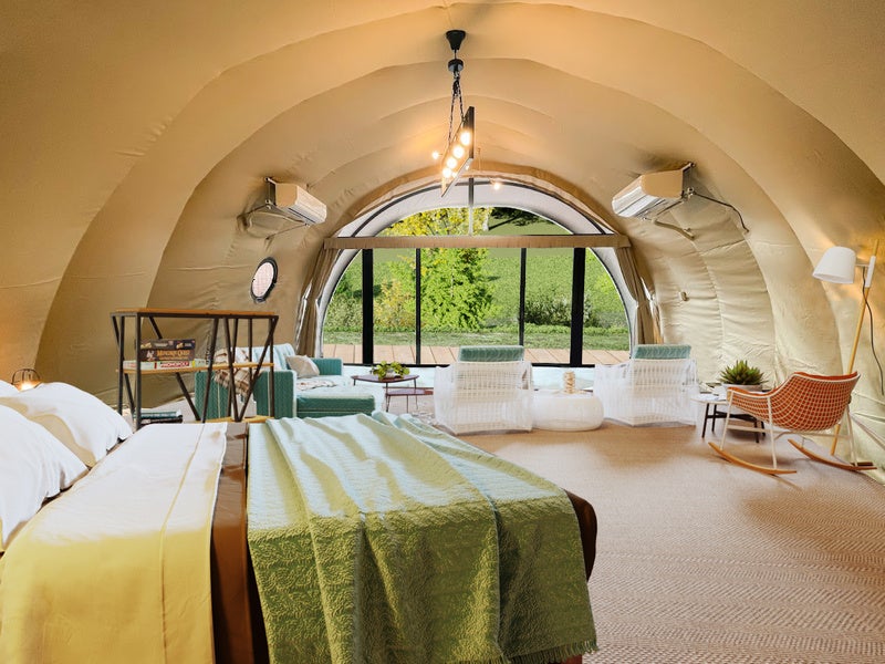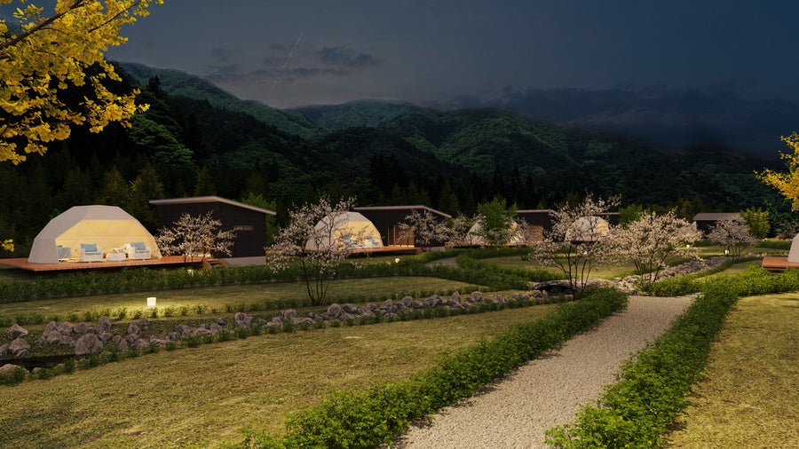 客室には阿智村エリア初となる宿泊可能な大型ドームテントや、ユニークな形状のロータスベルテント、愛犬同伴可能なコクーンテントを配置。