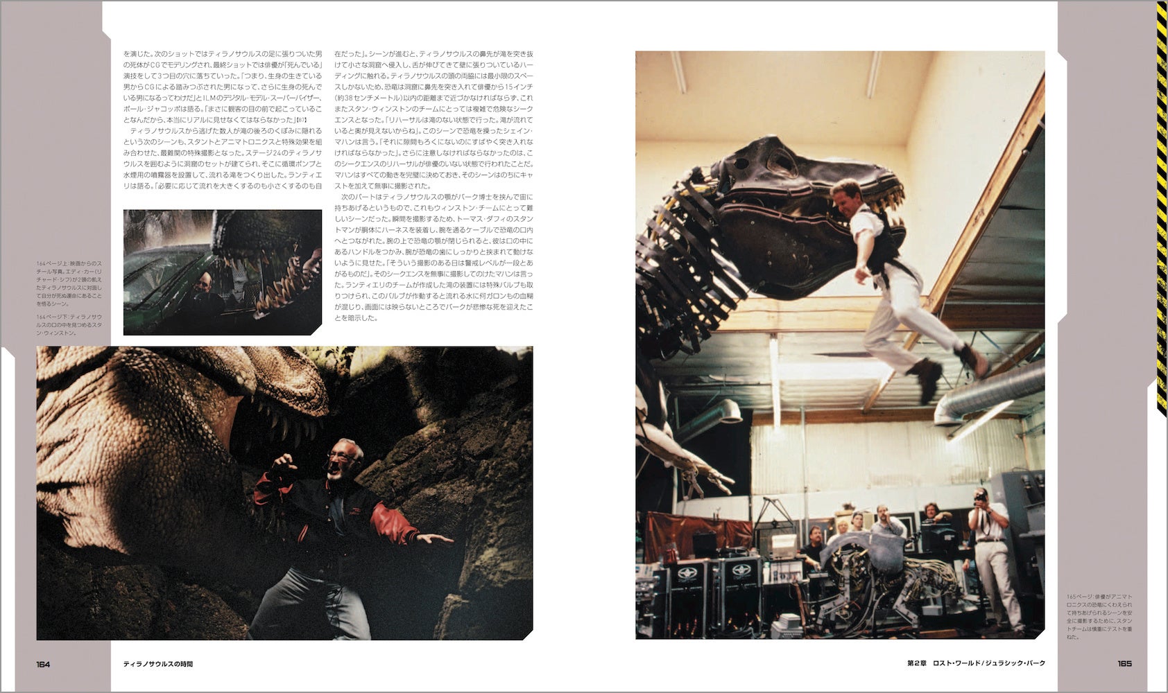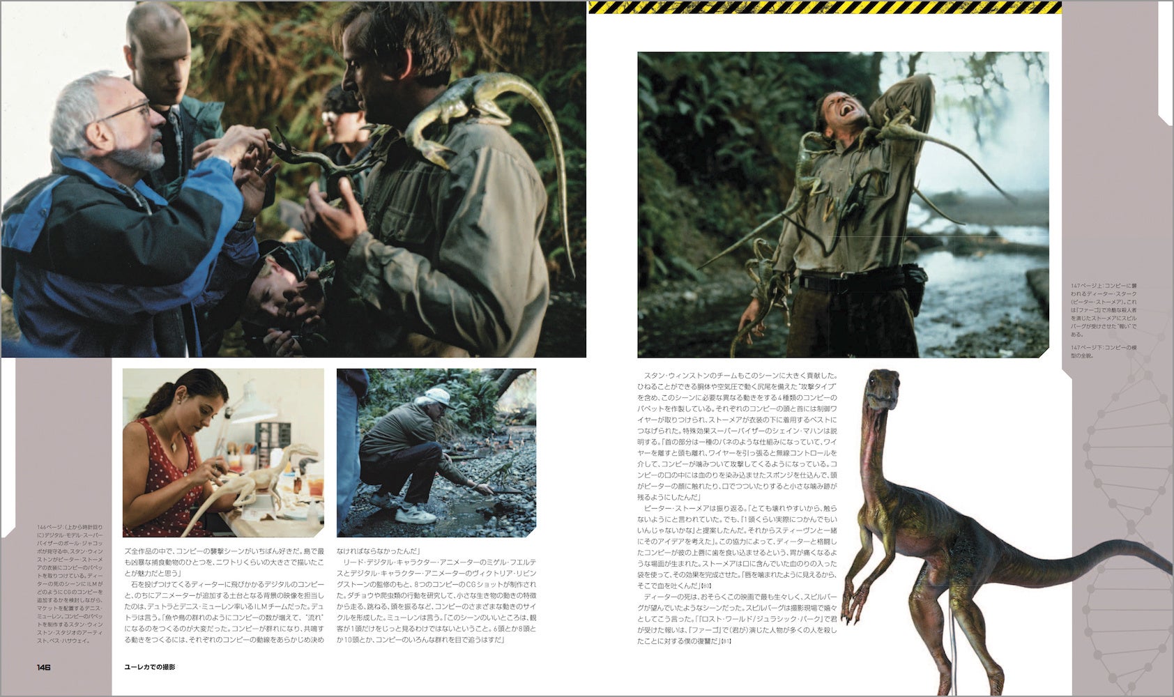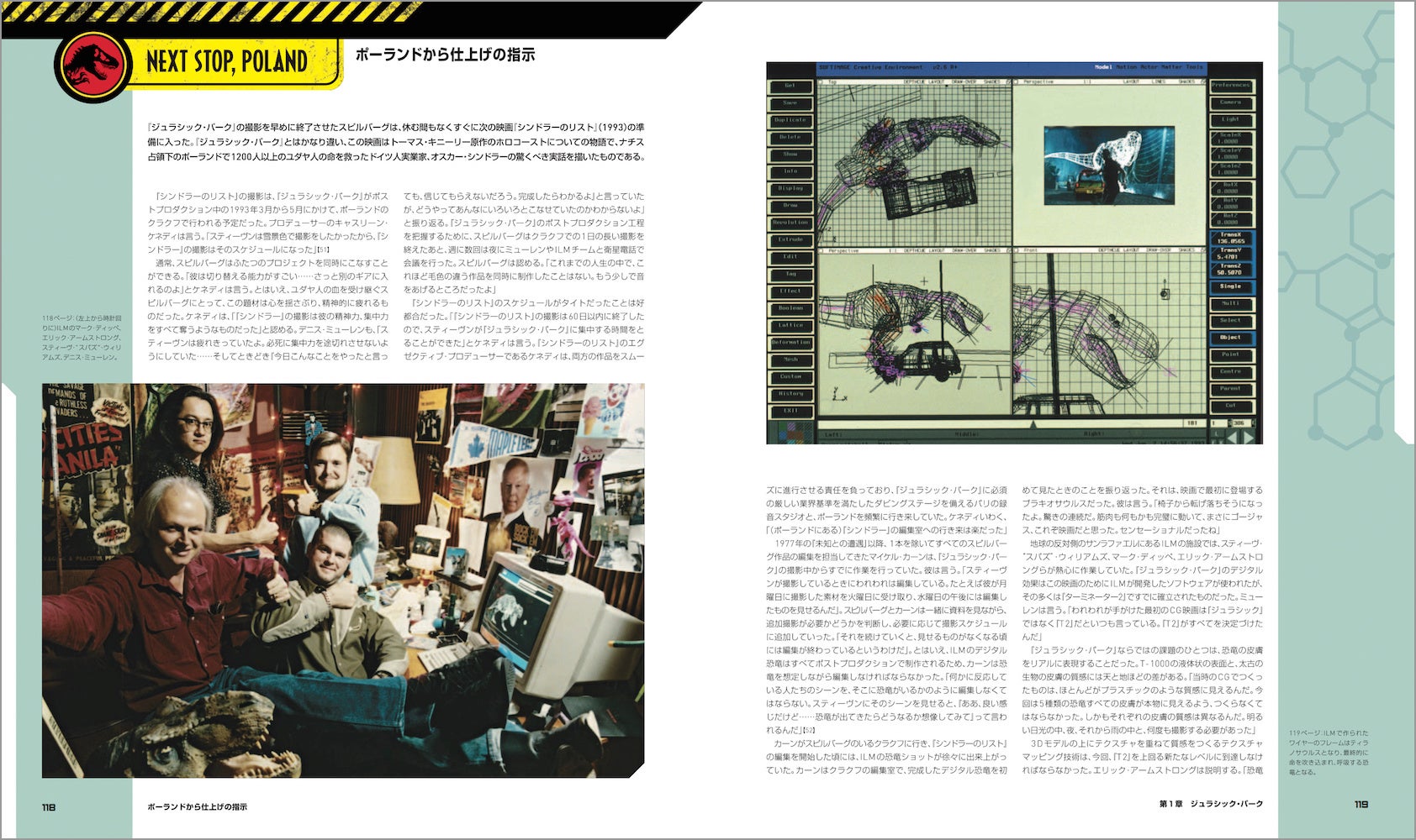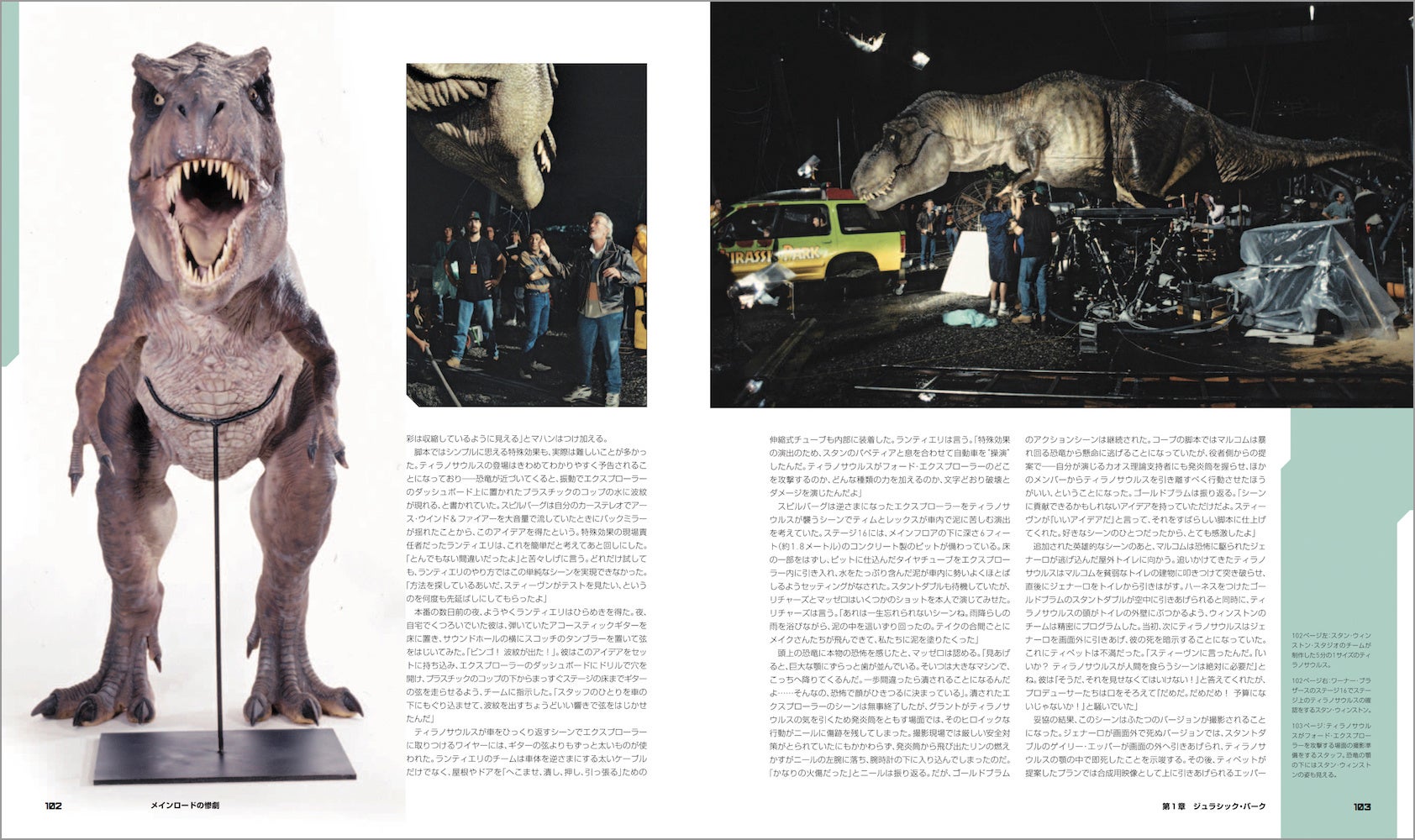 映画の主役・恐竜たちも詳しく紹介。スタン・ウィンストンとそのチームによるデザインからフルスケールの恐竜たちのメイキング、映画史を変えたデニス・ミューレンやスティーヴ・ウィリアムズらによるCG導入も、レストランでの初期ミーティングからお披露目まで順を追ってドキュメント。CGIがフィル・ティペットによるストップモーション・アニメにとって代わるまでのいきさつに加え、視覚効果に対するスピルバーグの心境がかわっていく様も克明に記されている。