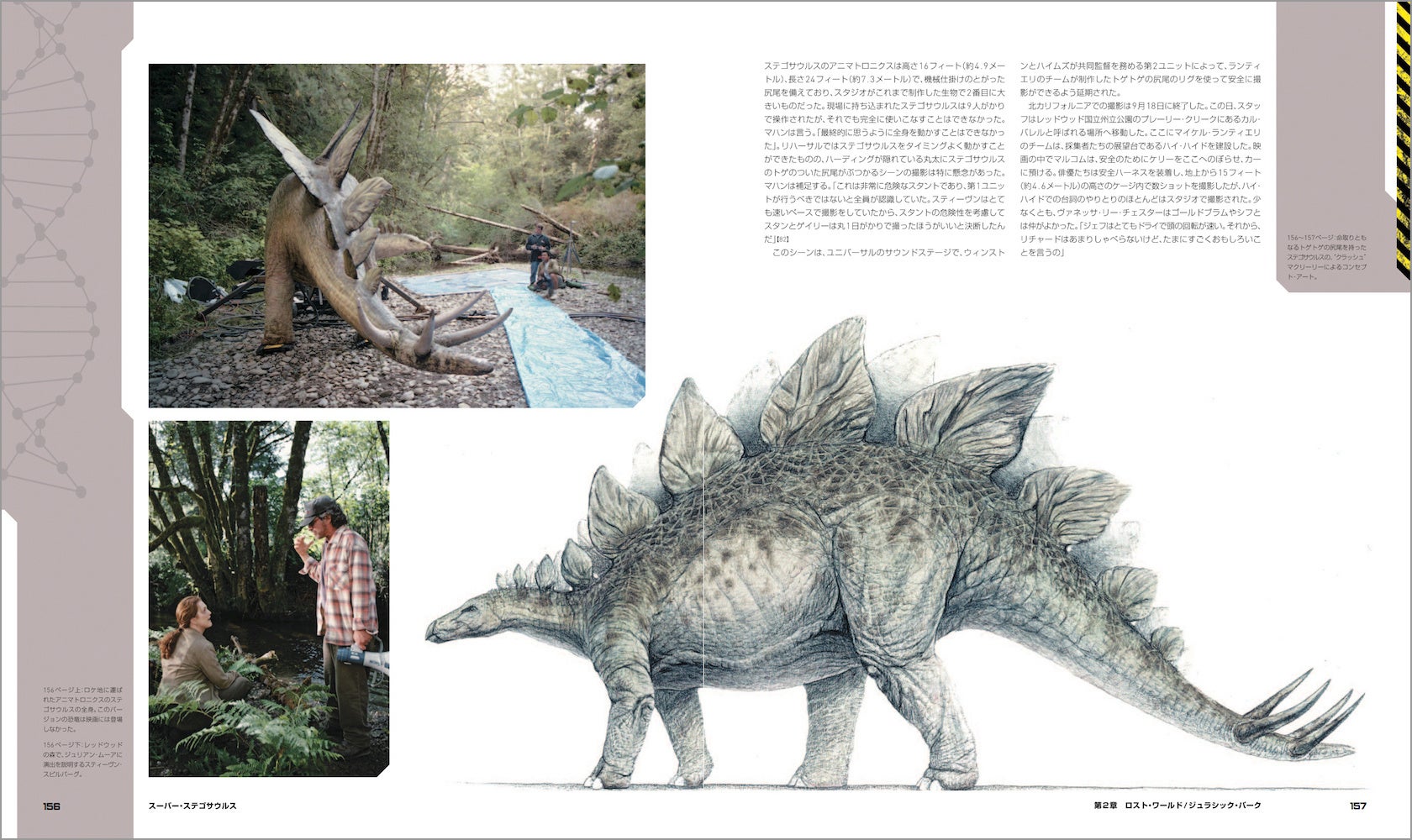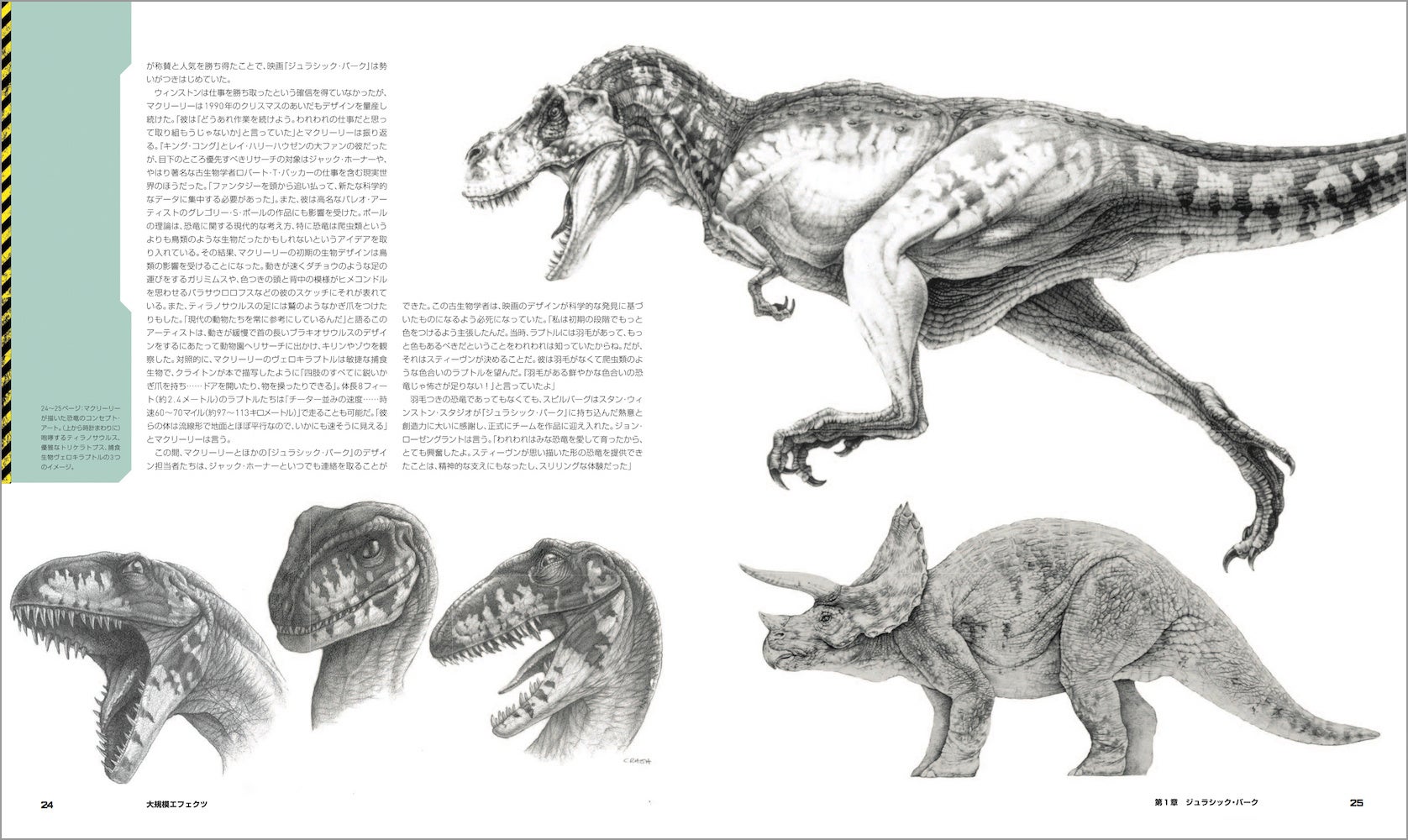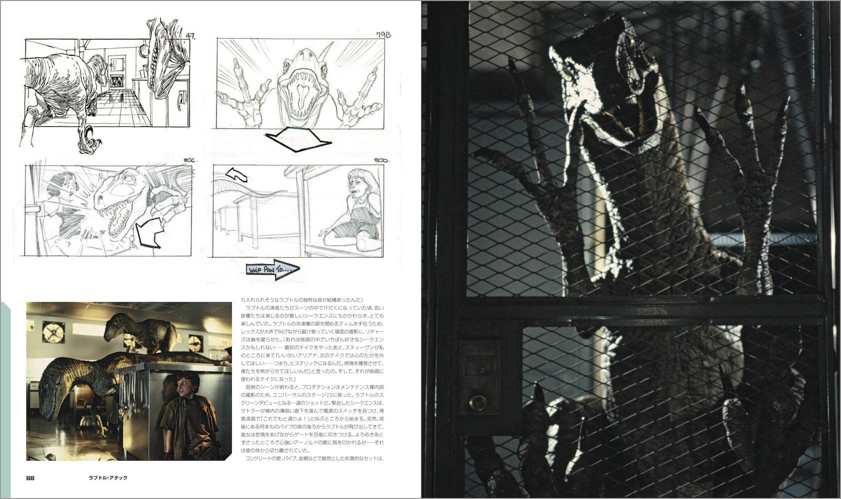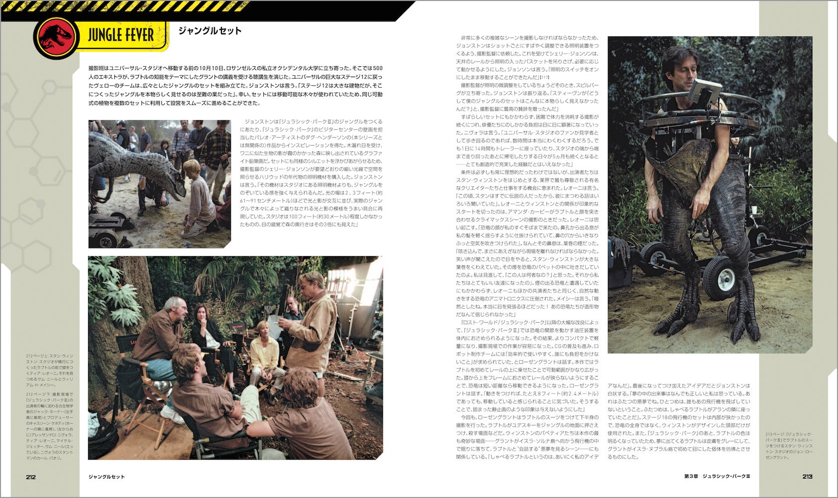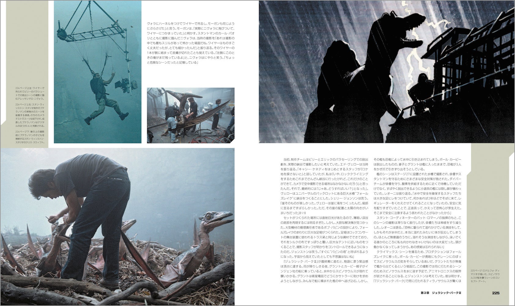 映画の主役・恐竜たちも詳しく紹介。スタン・ウィンストンとそのチームによるデザインからフルスケールの恐竜たちのメイキング、映画史を変えたデニス・ミューレンやスティーヴ・ウィリアムズらによるCG導入も、レストランでの初期ミーティングからお披露目まで順を追ってドキュメント。CGIがフィル・ティペットによるストップモーション・アニメにとって代わるまでのいきさつに加え、視覚効果に対するスピルバーグの心境がかわっていく様も克明に記されている。