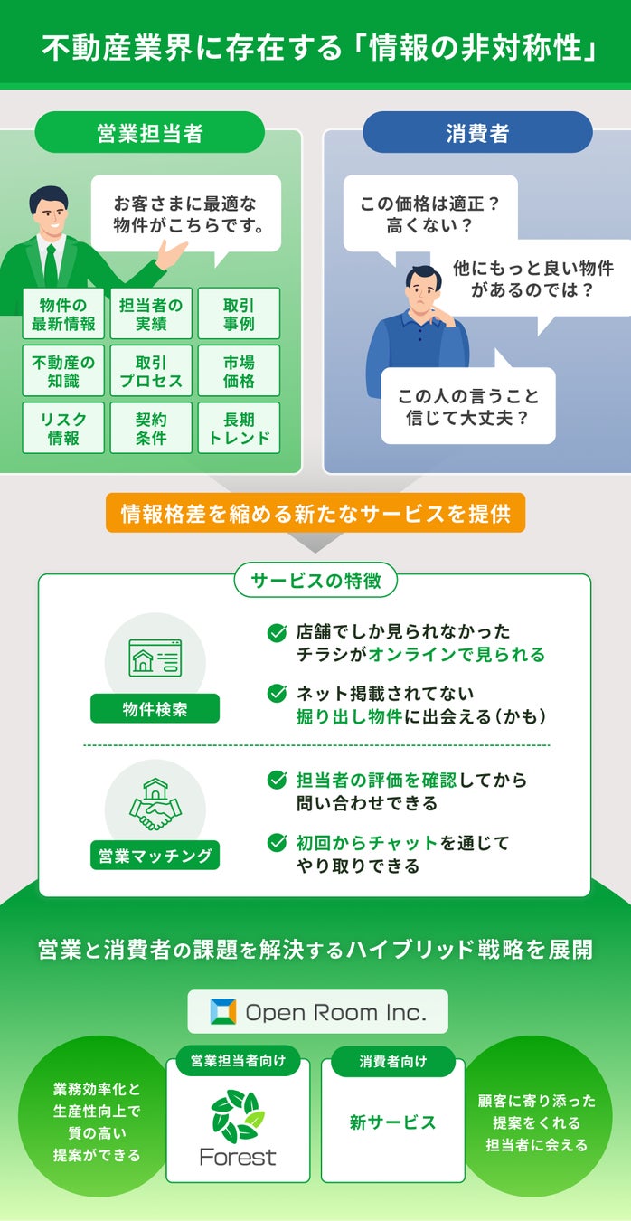 オープンルームは営業担当者の課題を解決する「フォレスト」に加えて、消費者の課題を解決する新たなサービスを2025年にリリースする計画です。消費者が最新の物件情報を簡単に検索・閲覧できるだけでなく、顧客評価が高く信頼できる営業担当者に出会える仕組みの提供を目指します。