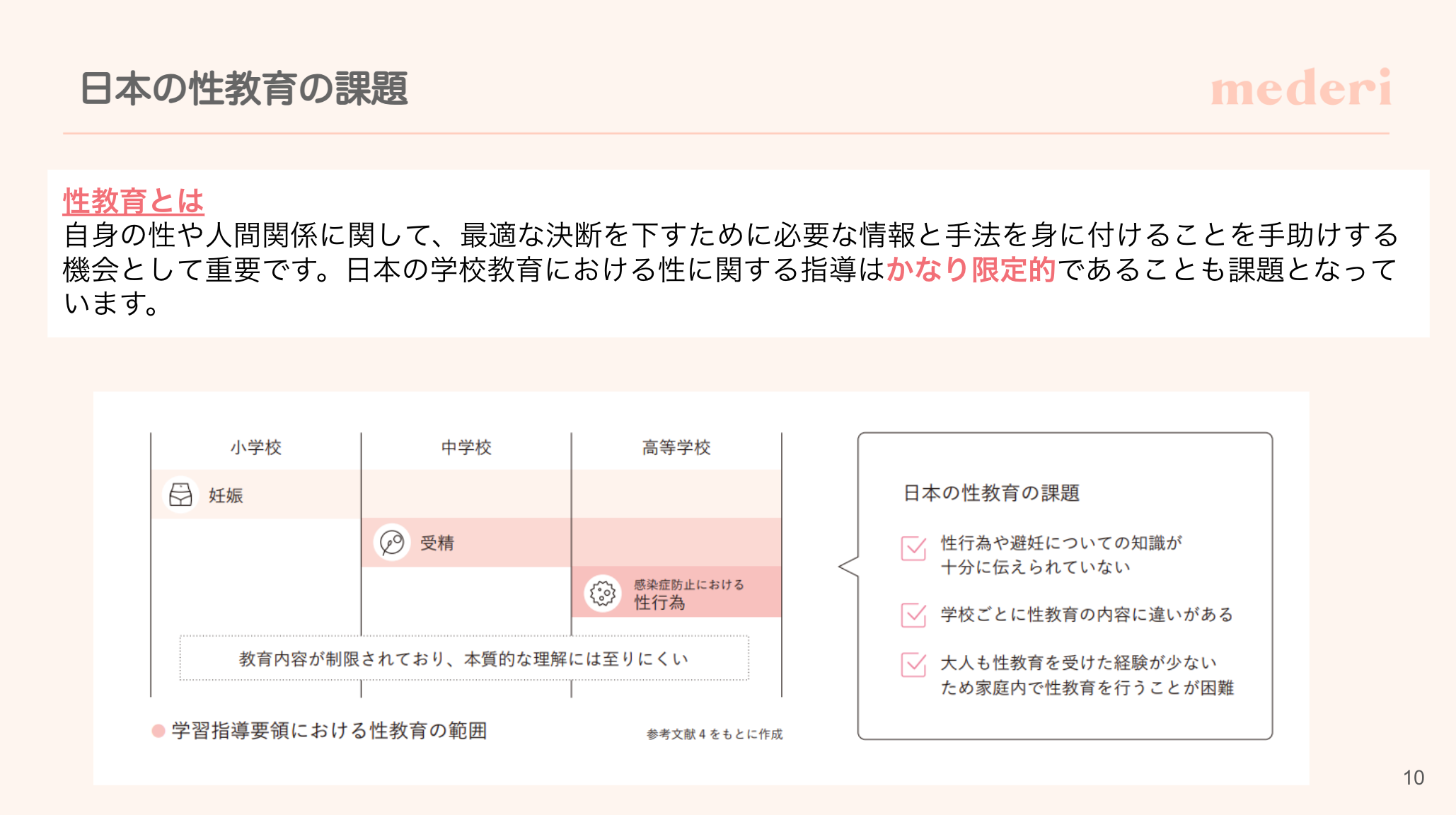 現在の学校教育では性に関する指導が限定的であり、性行為にかかわる事柄については十分な授業が実施されていないことが少なくありません。そうした背景のもと、最近ではメディアやSNSなどを通じて女性特有の問題が話題になることが増えており、正しい知識を学ぶことの機会や重要性が社会に浸透しつつあると言います。