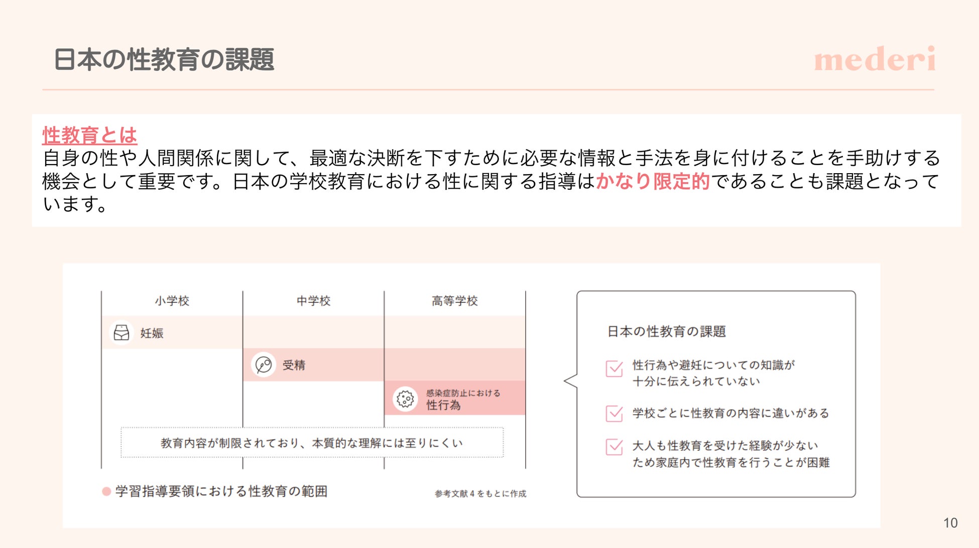 mederiでは、今後もさまざまな年代の男女へ向けて、生理/PMSに対する正しい理解や、ご自身の身体に合わせた選択肢の提供を目指して、女性の健康課題や性教育に関するセミナー活動を実施していく予定です。引き続き、オンラインピル診療サービス『mederi Pill』、法人向け福利厚生サービス「mederi for biz」の提供を通して「女性の生きやすさ」の実現に取り組んでまいります。
