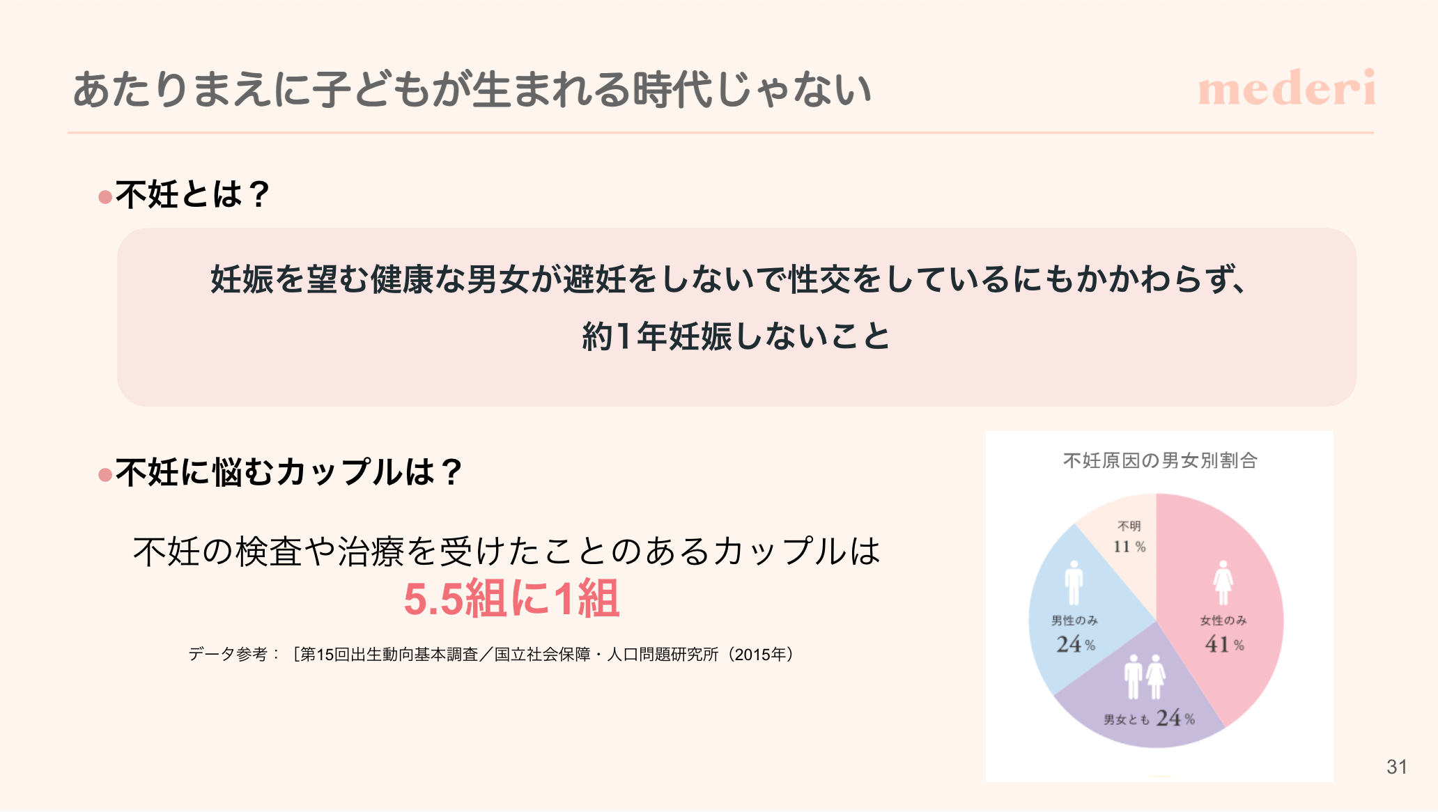 後半では、生殖医療の進歩にも関わらず、不妊症の症例数は増加傾向にあり、日本では5.5組に1組のカップルが不妊治療を経験しているという現状を紹介。不妊の原因は女性だけでななく、男性や双方が抱える問題に起因している場合もあると言います。どちらか片方のみではなく、男女が共に問題と向き合うことが重要です。
