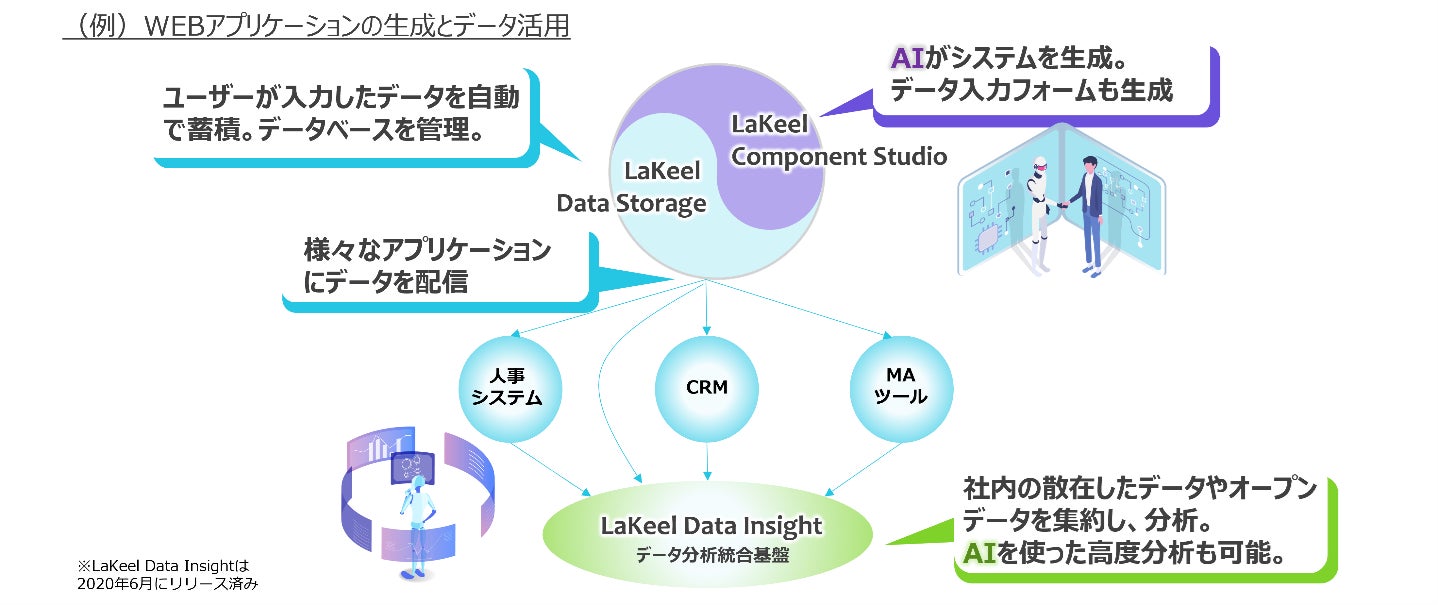 AIを活用して業務システムを生成し、そのシステム上で入力されたデータは「LaKeel Data Storage」に自動で蓄積されるようになります。蓄積されたデータは複数のアプリケーションに配信することができ、データ分析統合基盤「LaKeel Data Insight」へ配信すれば、AIを活用したデータ分析が実現でき、更なる生産性向上が見込めます。