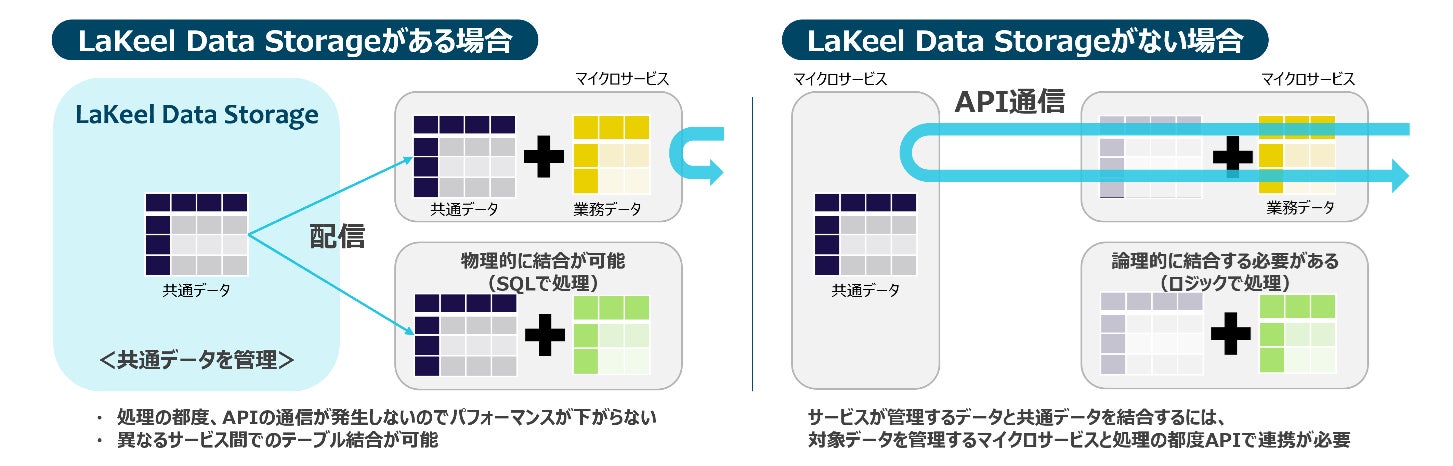 LaKeel DXはマイクロサービスアーキテクチャを採用しています。新機能である「LaKeel Data Storage」はマスタデータを一元管理しつつ、各サービスにデータを配信する仕組みです。マイクロサービスの弱みであるAPI通信によるパフォーマンス低下を防止し、データの整合性を担保します。