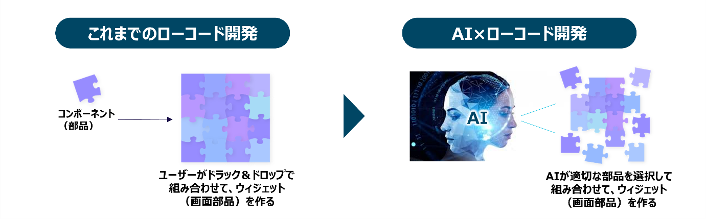 LaKeel DXはソフトウェアを部品化し、部品(コンポーネント)を組み合わせることで、目的の業務アプリケーションを作ることができるプラットフォームです。新機能である「LaKeel Component Studio」は無数の部品からAIが適切な部品を選択して、業務で必要なシステムが自動で開発される世界を目指して作られています。これにより、ビジネス部門の人がアイディアを素早くシステムに反映することができるようになります。AIを使用した開発は運用中にデータを学習することも強みの一つです。部品の品質は向上し続け、ニーズにあった部品の組み合わせ精度も向上していきます。
