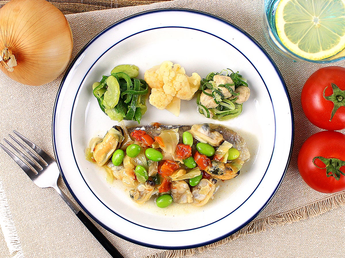 ホロホロとした身がおいしい鱈をアクアパッツァに仕上げました。アサリ、ムール貝を使用し、貝類の出汁とドライトマトの旨味が一体となったプレートです。枝豆が添えられており、見た目からも春を感じられます。
