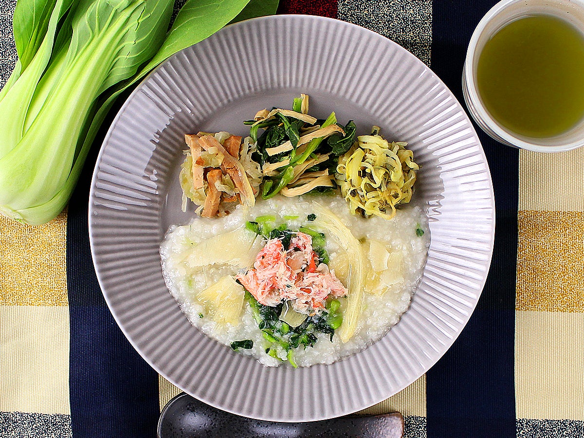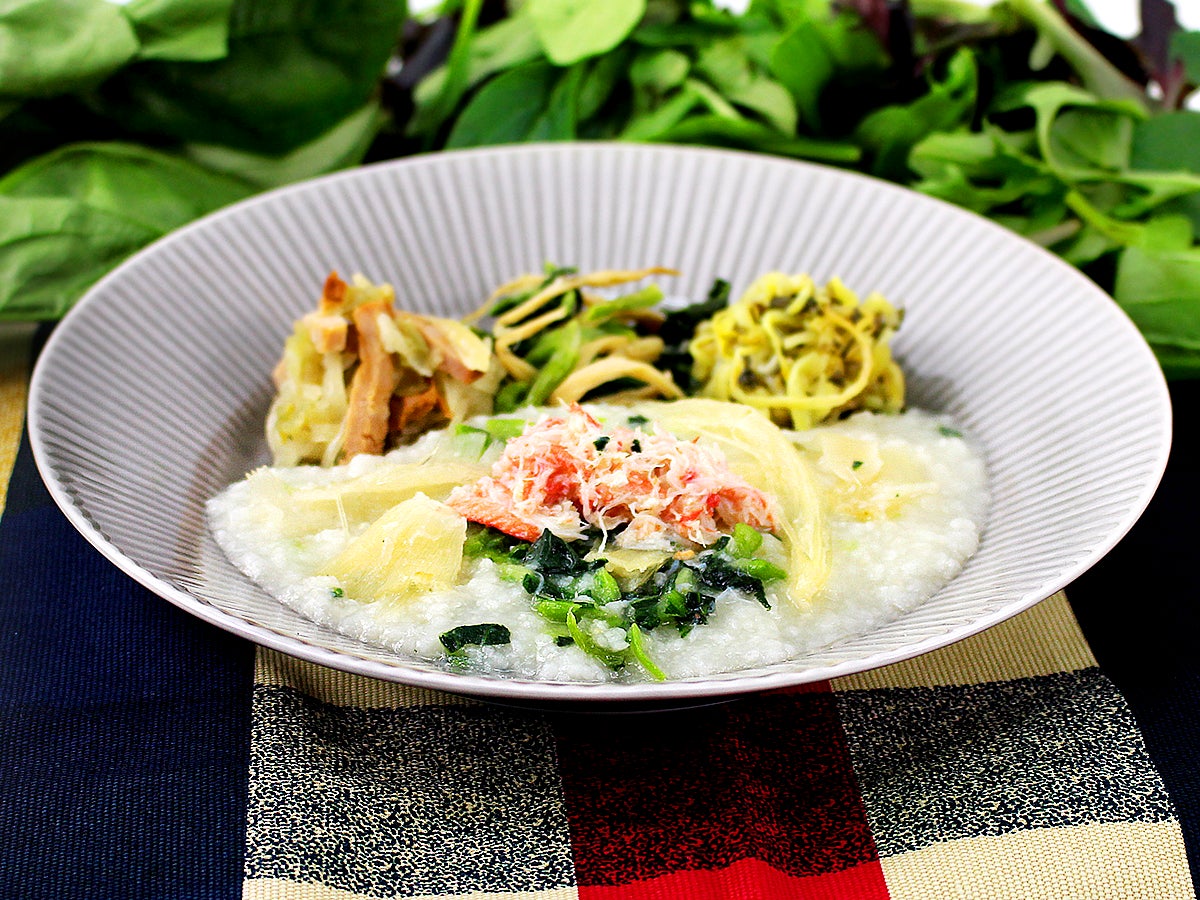 鶏と野菜と魚介の出汁がきいたヘルシーかつ優しいお粥は朝食に最適です。香港ではお粥を提供するレストランは、朝から大盛況です。具材には刻んだ小松菜、紅ズワイガニのほぐし身、中華料理の高級食材で知られる糸状のフカヒレを使用しております。フカヒレとお粥との食感の違いをお楽しみください。