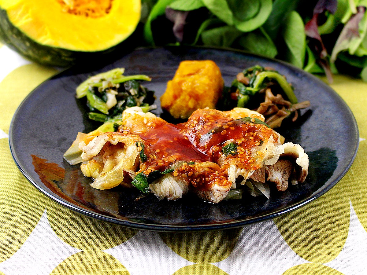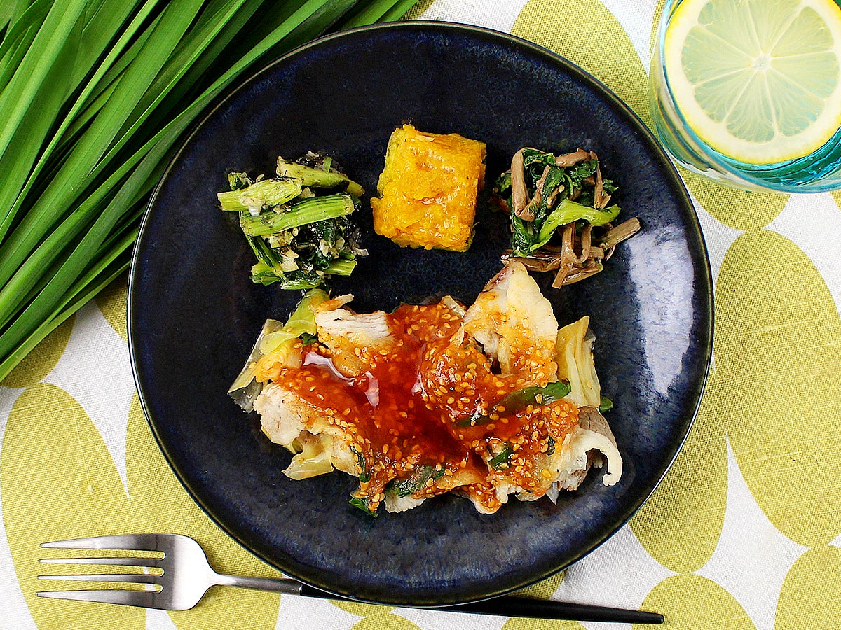 副菜は、のりの風味が香るねぎと小松菜ののりナムル、ほっくりカボチャ、春の山菜であるぜんまい・からし菜をごま油で味付けしたごま油香る春の山菜です。