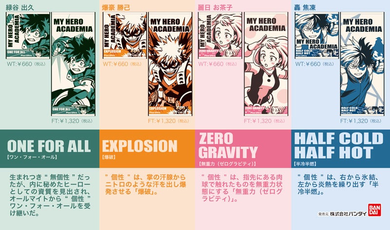 本商品は、TVアニメ『僕のヒーローアカデミア』の主要キャラクターのタオル商品となります。タオルは各キャラクターのイメージカラー、下部にはキャラクター毎の特殊能力である"個性"の名前をデザインしました。普段使いはもちろん、様々なシーンで使用いただけます。