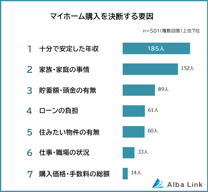 最後に、「マイホーム購入を決断するに際し、影響を与える要因は何か」を聞いたところ、1位は「十分で安定した年収(185人)」でした。次ぐ2位は「家族・家庭の事情(152人)」、3位「貯蓄額・頭金の有無(89人)」、4位「ローンの負担(61人)」と続きます。