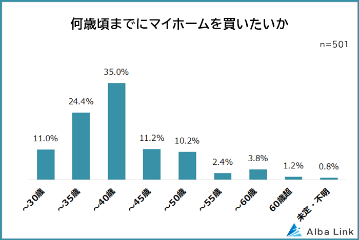今回、株式会社AlbaLink( https://albalink.co.jp/ )が運営する訳あり物件買取ナビ( https://albalink.co.jp/realestate/ )は、マイホームを持ちたいとお考えの501人を対象に「マイホーム購入のタイミング」についてアンケート調査を実施しました。