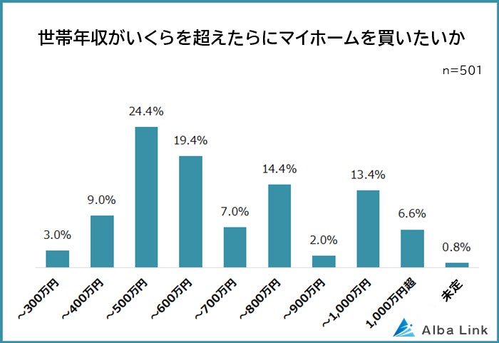 続いて、「世帯年収がいくらを超えたらマイホームを買いたいか」を聞きました。