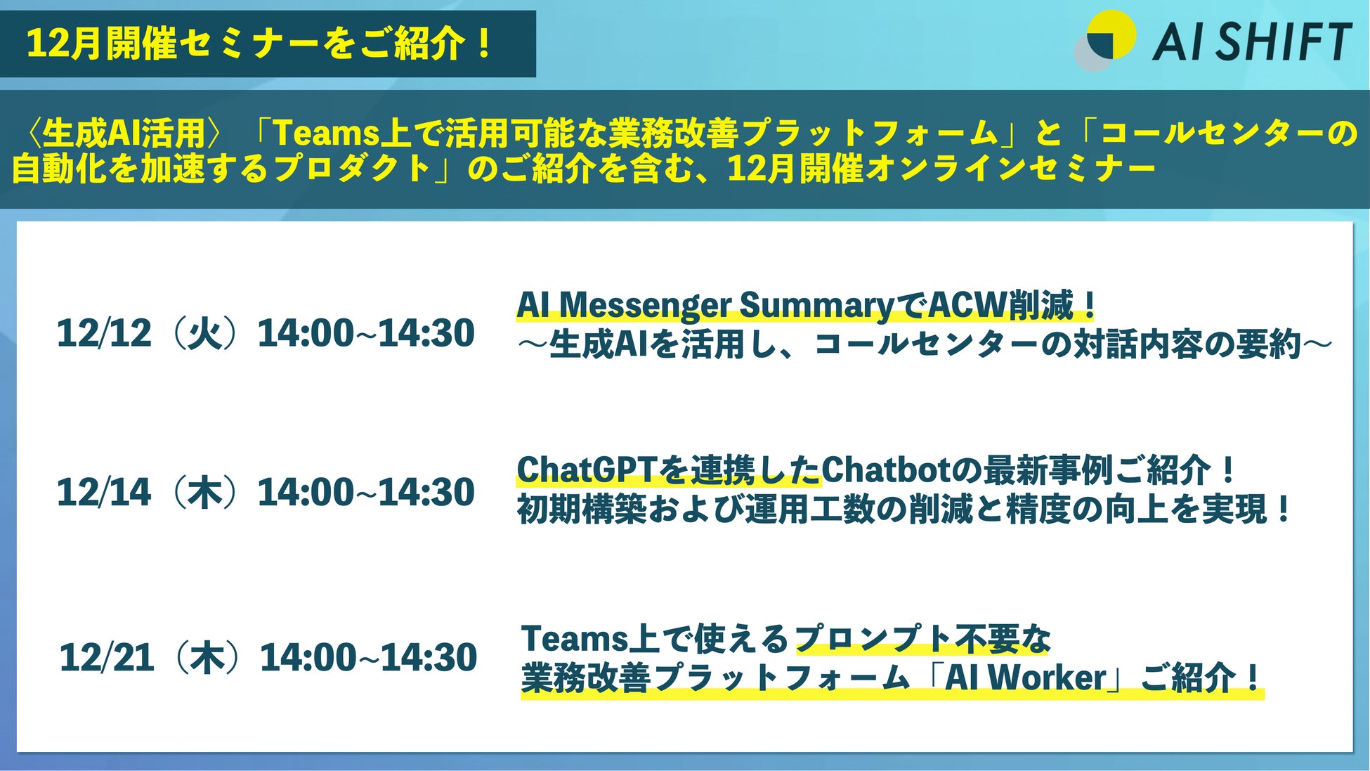 <生成AI活用>Teams上で活用可能な業務改善プラットフォームとコールセンターの自動化を加速するプロダクトのご紹介を含む、12月開催オンラインセミナー