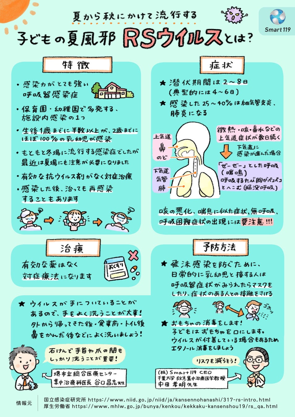 千葉大学発医療スタートアップ企業である株式会社Smart119(本社:千葉県千葉市、代表取締役社長/CEO:中田孝明)は、RSウィルスについてのイラストレーションを本日一般公開しました。夏から冬にかけて子どもの間で流行する風邪は大半がRSウイルスによるもので、RSウィルス感染症はいわゆる「夏風邪」の代表的疾患です。RSウイルスは乳児で半数以上、2歳までにほぼ100%の子どもが感染するほど伝播力が強くち、有効な抗ウイルス薬がないうえ、特別な治療方法も確立されていません。また治癒後に再感染することもあるやっかいなウイルスです。症状、予防方法のポイントを親しみやすいマンガで解説します。本資料は学校、企業、公共機関、町内会等で自由に配布・利用していただくことが可能です。
