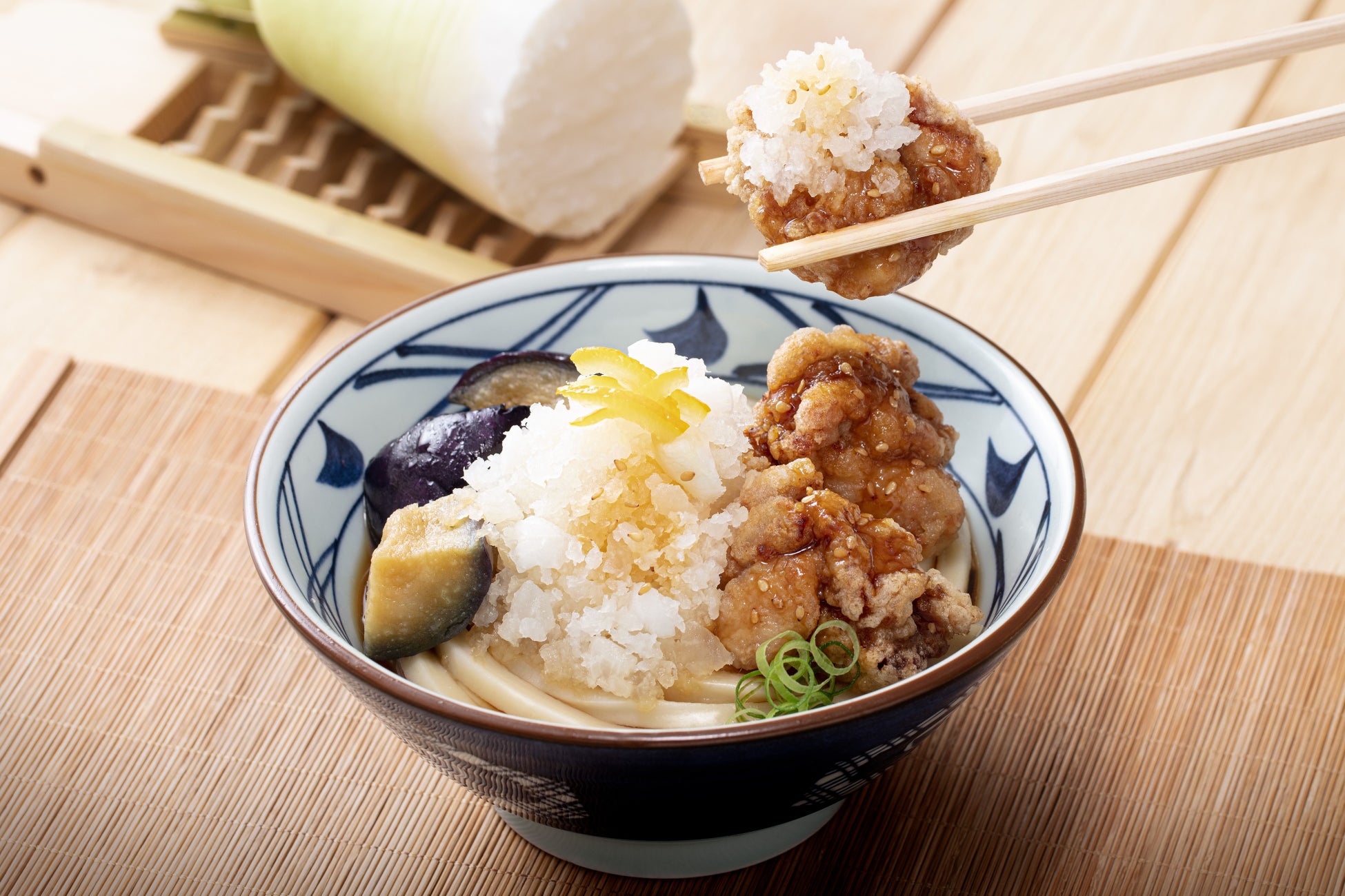 旨みが染み込んだ肉汁たっぷりの鶏ももから揚げは、そのままで味わってもよし、鬼おろしと一緒にさっぱり感をプラスして味わうもよし、つるつるもちもちのうどんやだしと一緒に頬張り、ボリューム感あふれる食感や味わいをお楽しみください。