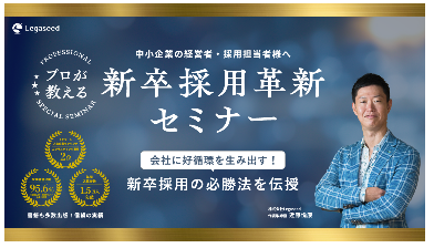 株式会社Legaseedは2013年に設立し、主に中小企業の新卒採用を主軸に経営や組織のコンサルティングをしている企業です。ゲーミングシミュレーション、アクションラーニングの他に、学生を魅了付けするための採用ATS「miryo⁺」を用いた人材採用や人材育成の仕組みを全国650社以上の企業が導入。研修の受講生は延べ100,000人を超えます。またLegaseedは中小企業である中で、楽天みん就みんなの就職活動日記の2021年卒業予定の学生を対象に調査した「2021年卒インターン人気企業ランキング」にて総合ランキング「10位」を獲得し、年間約1.7万人の新卒採用応募実績があります。