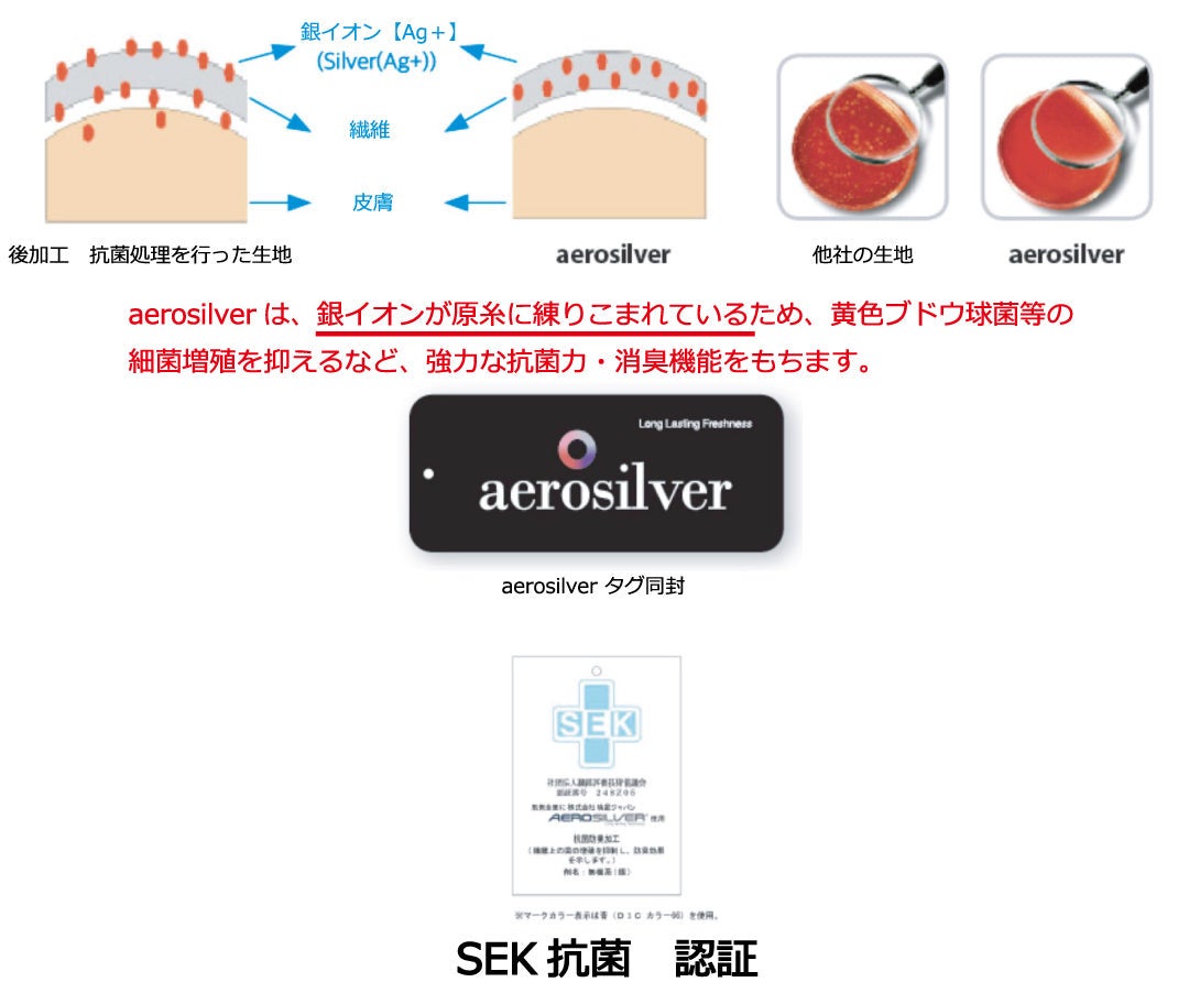 銀化合物を練り込んだ抗菌糸<aerosilver>を使用。特定の菌(黄色ブドウ球菌、肺炎球菌など)の増殖を抑えるのに役立ち、繰り返し洗濯してご使用いただけます。