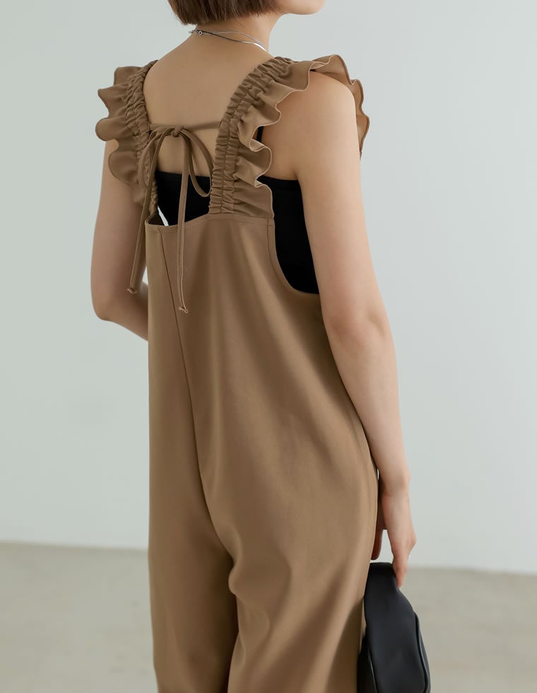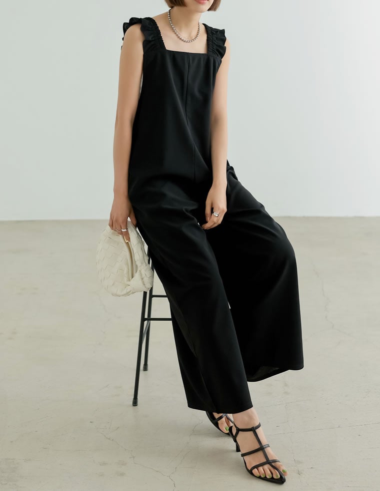 [低身長サイズ有][洗濯機で洗える]フリルストラップスクエアネックオールインワン