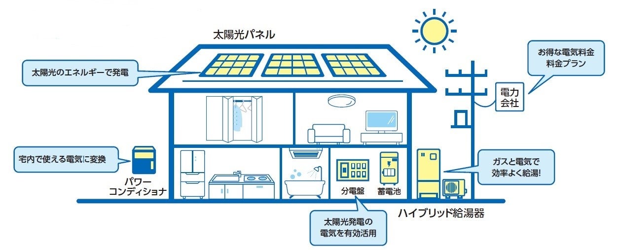 その他に、Looopでは太陽光発電システムと蓄電池、Looopの電気料金、ハイブリッド給湯器をセットにした「とくするソーラー 蓄電池付きプラン」も提供しています。ニーズに応じて蓄電池の台数が選べるほか、停電時にも住宅全体に電力供給され、ガスで給湯できるなど、非常時の備えとしても使えます。