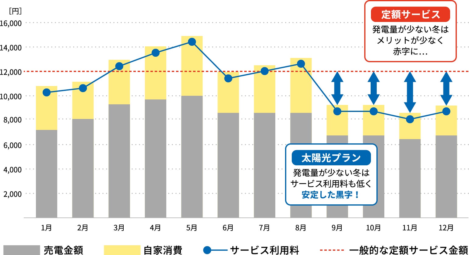 太陽光発電システムをリースで提供するプラン。月々のリース料金を発電量のシミュレーション値に応じて変動させることで経済メリットも出せることが特徴です。日中発電した電力は建物の設備に供給され、余剰電力は電力会社に売電。夜間は電力会社から電気を購入。初期費用0円で導入でき、契約期間満了後、システムはお客様に無償譲渡されます。当社独自のリーススキームなので、住宅ローン審査にも影響しにくくなっています。